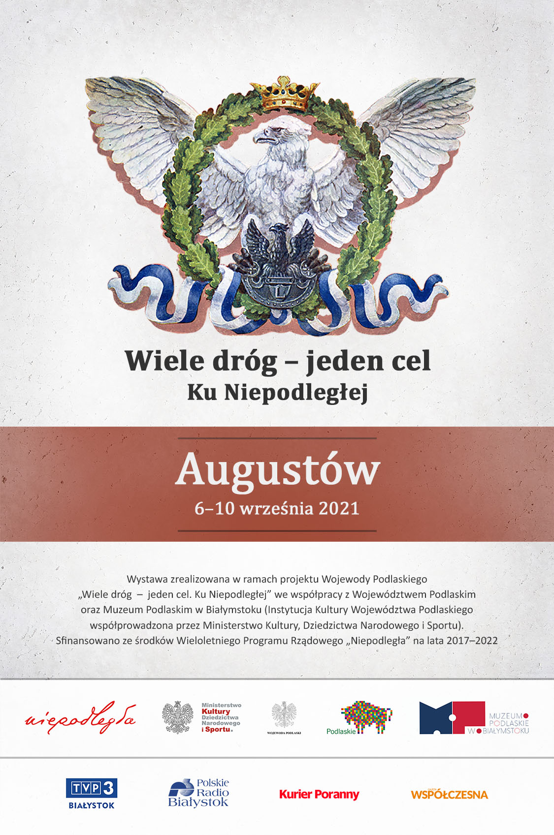 Wystawa jest realizowana w ramach projektu Wojewody Podlaskiego „Wiele dróg - jeden cel. Ku Niepodległej” we współpracy z Województwem Podlaskim oraz Muzeum Podlaskim w Białymstoku. Projekt został sfinansowany ze środków Wieloletniego Programu Rządowego „Niepodległa” na lata 2017 – 2022. Za jego stronę merytoryczną odpowiadali pracownicy Muzeum Podlaskiego w Białymstoku: Krzysztof Kossakowski, Paweł Okołot i Piotr Niziołek.