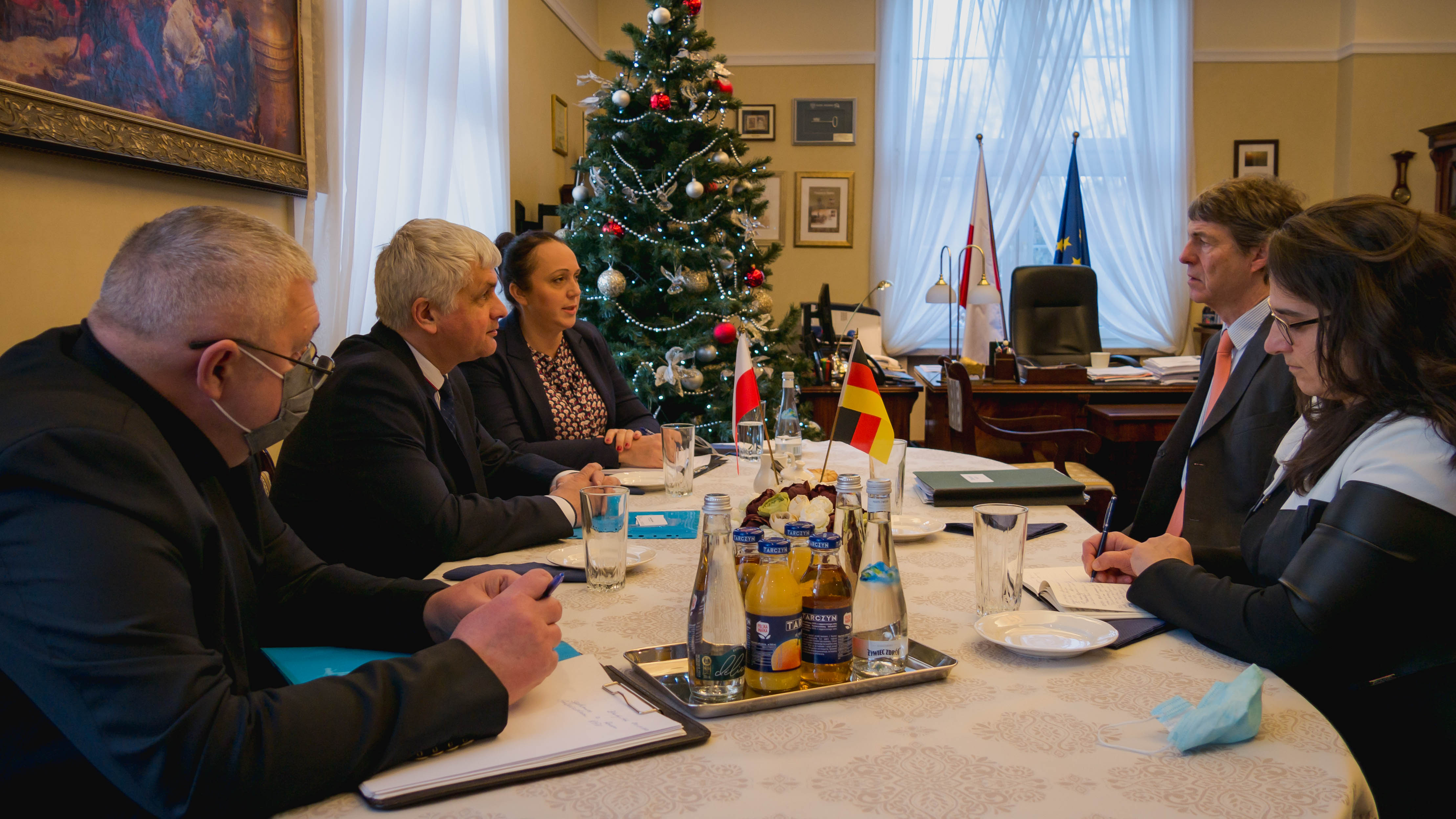 W spotkaniu wojewody podlaskiego Bohdana Paszkowskiego z ambasadorem Niemiec Arndtem Freytagiem von Loringhoven udział wzięli także: Silja Waibel - kierownik Wydziału Politycznego Ambasady Niemiec oraz Jarosław Cezary Worobiej - dyrektor Wydziału Programów Rządowych i Funduszy Europejskich PUW.