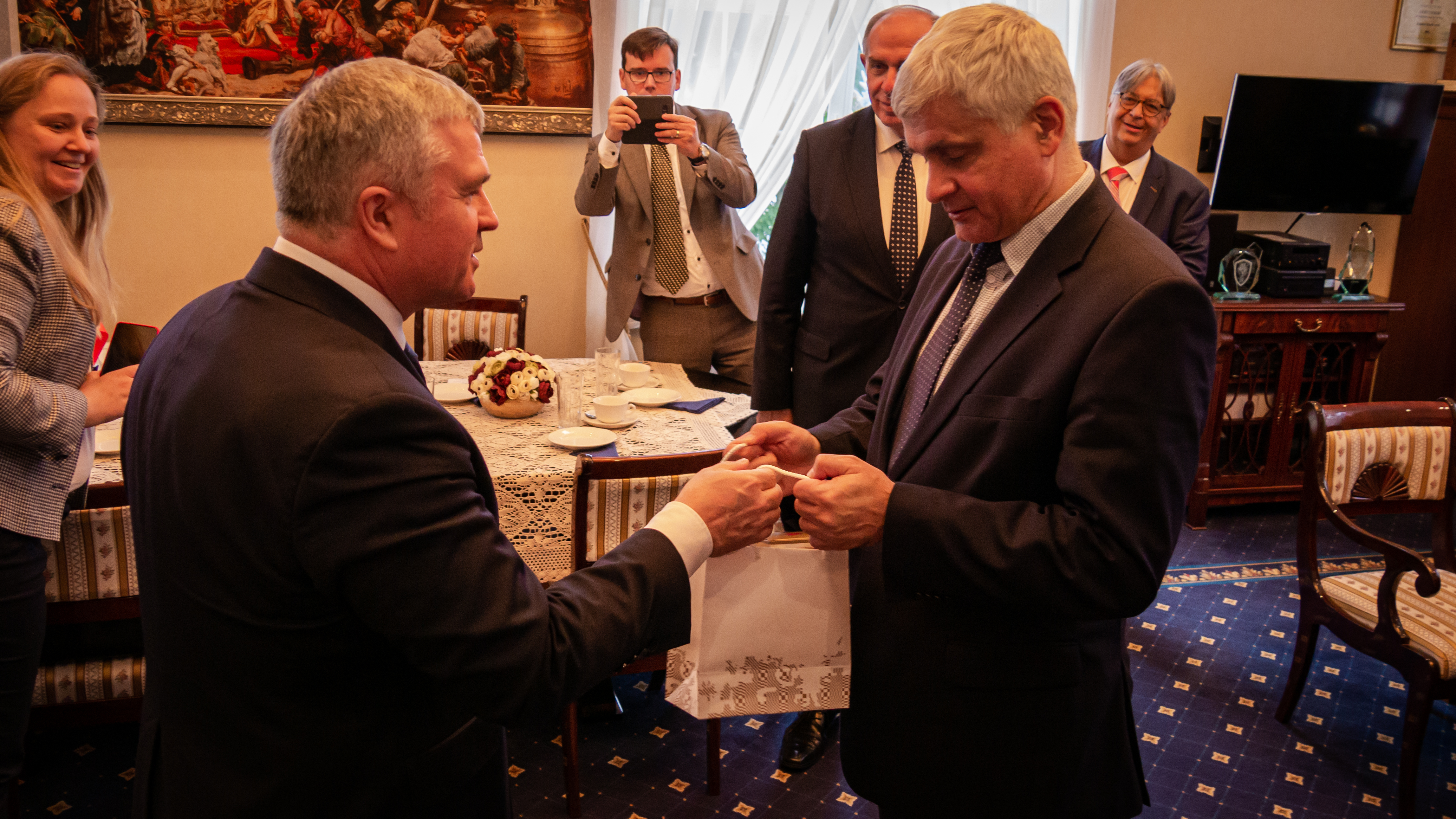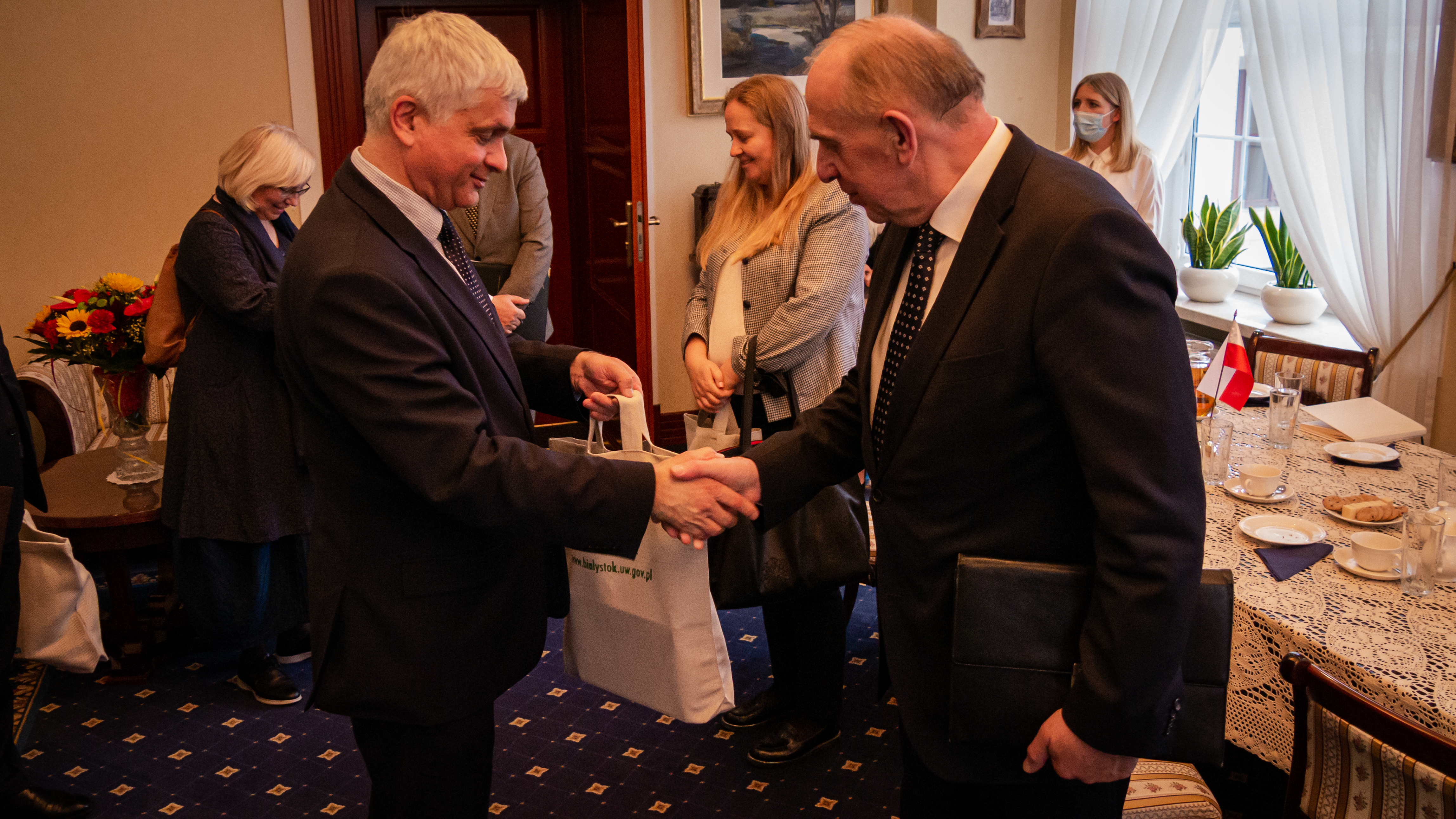 W spotkaniu z wojewodą podlaskim udział wzięli także: Liliana Jaroslavska – II sekretarz Ambasady Republiki Litewskiej w Rzeczypospolitej Polskiej, Vainius Kuzmickas – III sekretarz Ambasady Republiki Litewskiej w Rzeczypospolitej Polskiej, Remigijus Motuzas - szef Konsulatu Republiki Litewskiej w Sejnach oraz Ilona Wakuluk - dyrektor Podlaskiego Klubu Biznesu.