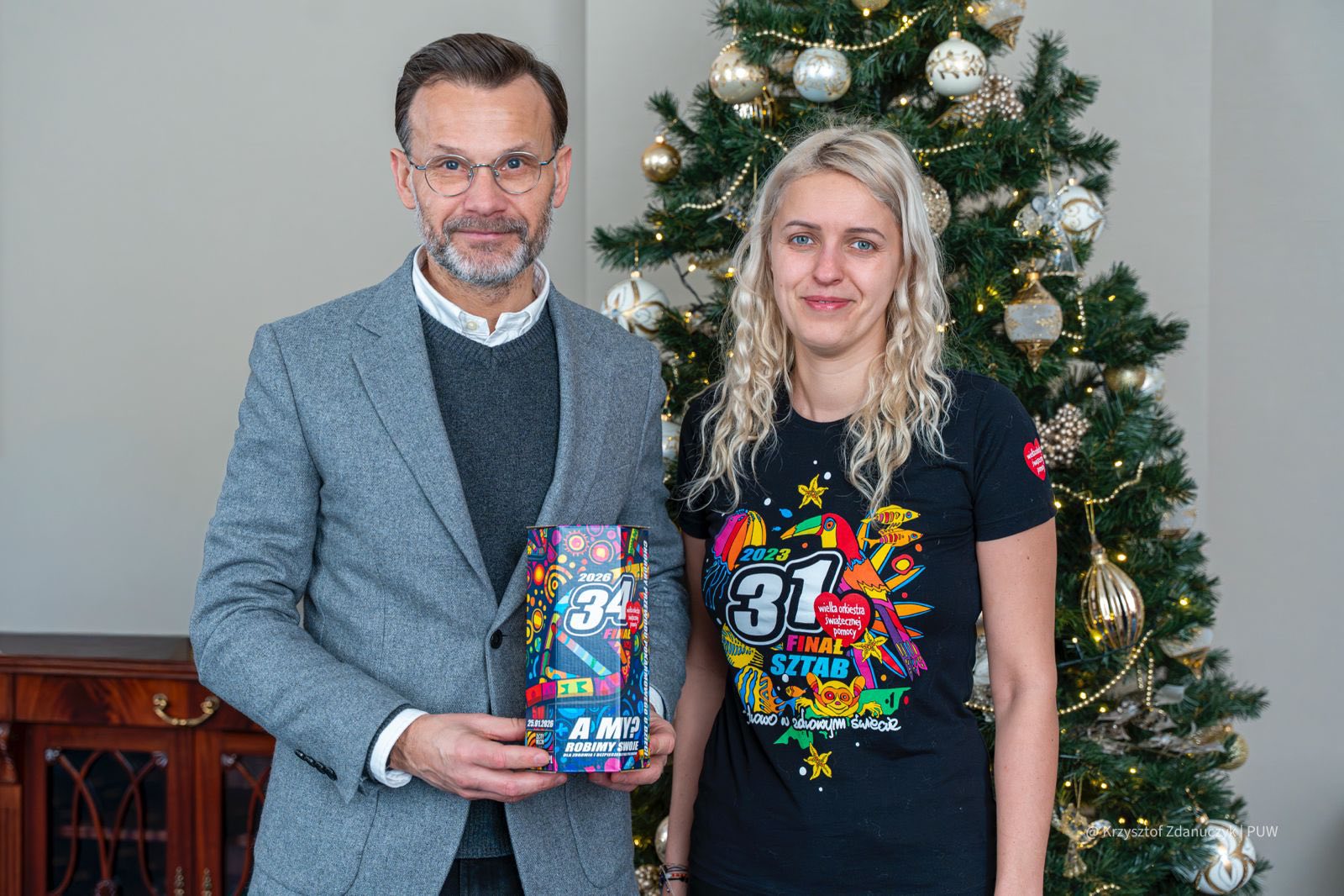 Wojewoda podlaski Jacek Brzozowski przyjął skarbonkę od przedstawicielki sztabu Wielkiej Orkiestry Świątecznej Pomocy w Białymstoku. Dzięki temu pracownicy naszego urzędu będą mogli włączyć się w 34. finał WOŚP zorganizowany pod hasłem "Zdrowe brzuszki naszych dzieci".