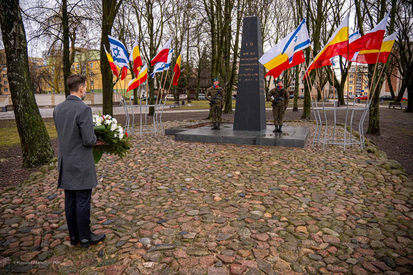 Wojewoda Jacek Brzozowski złożył kwiaty i znicz-światło pamięci pod Pomnikiem Powstańców Getta