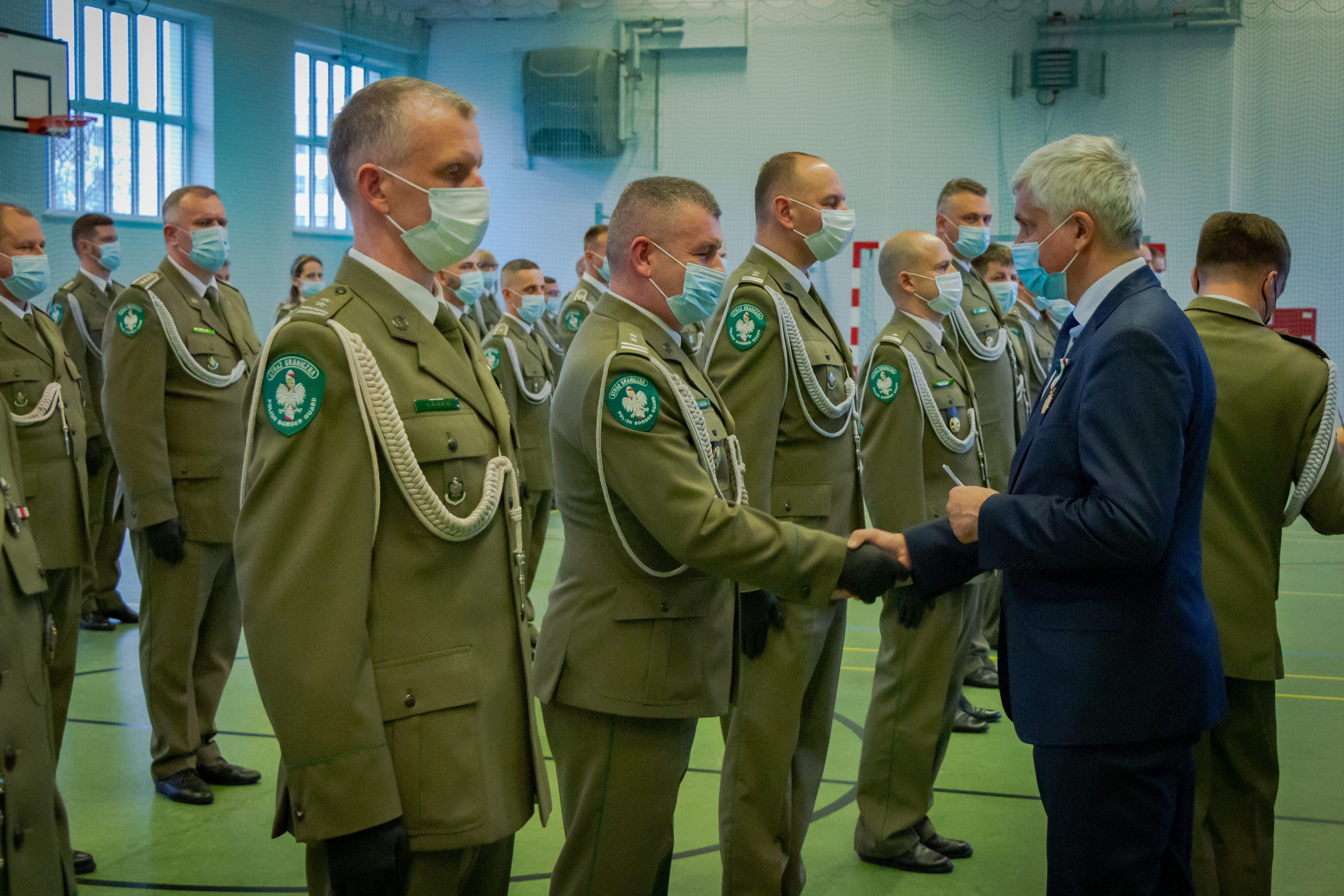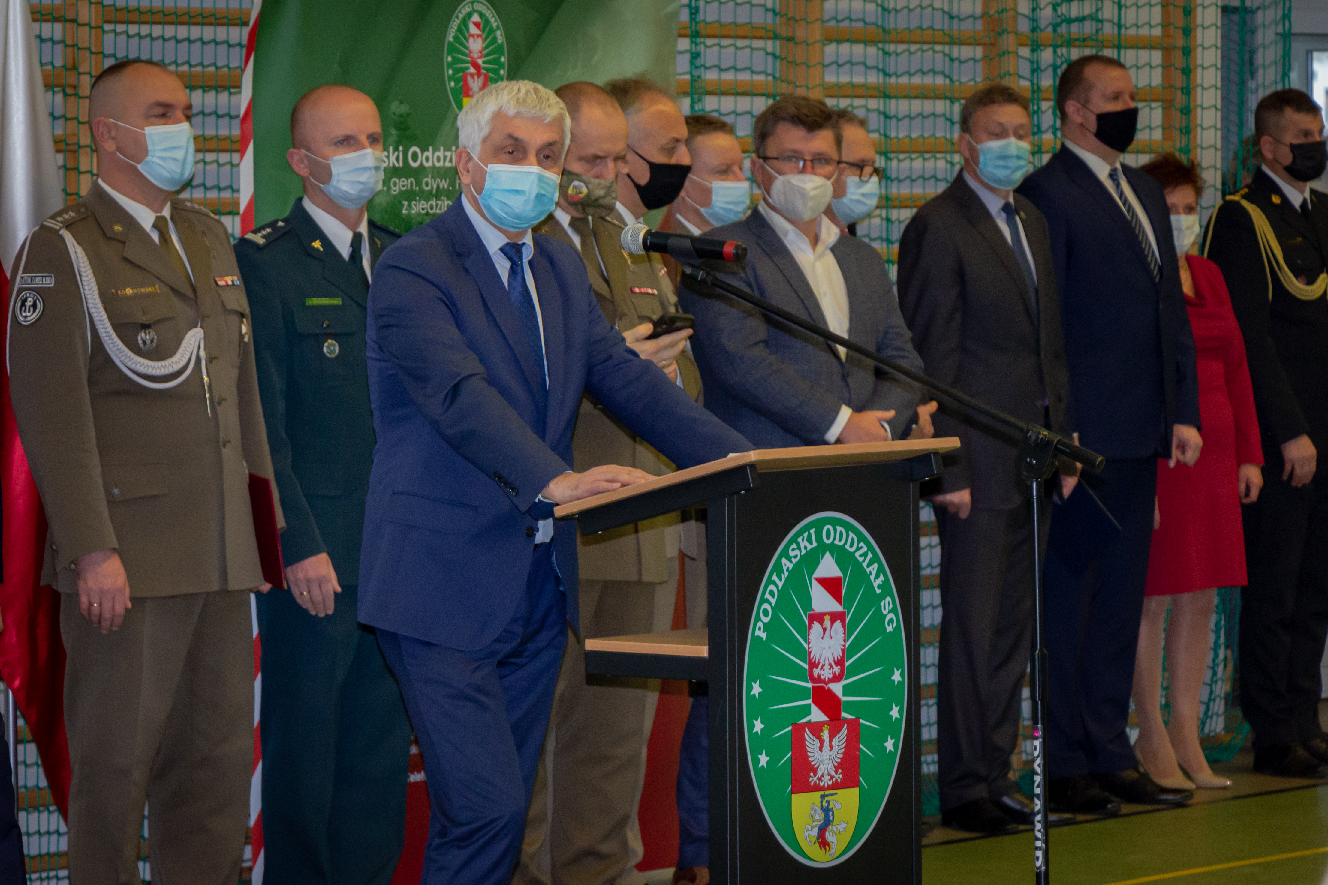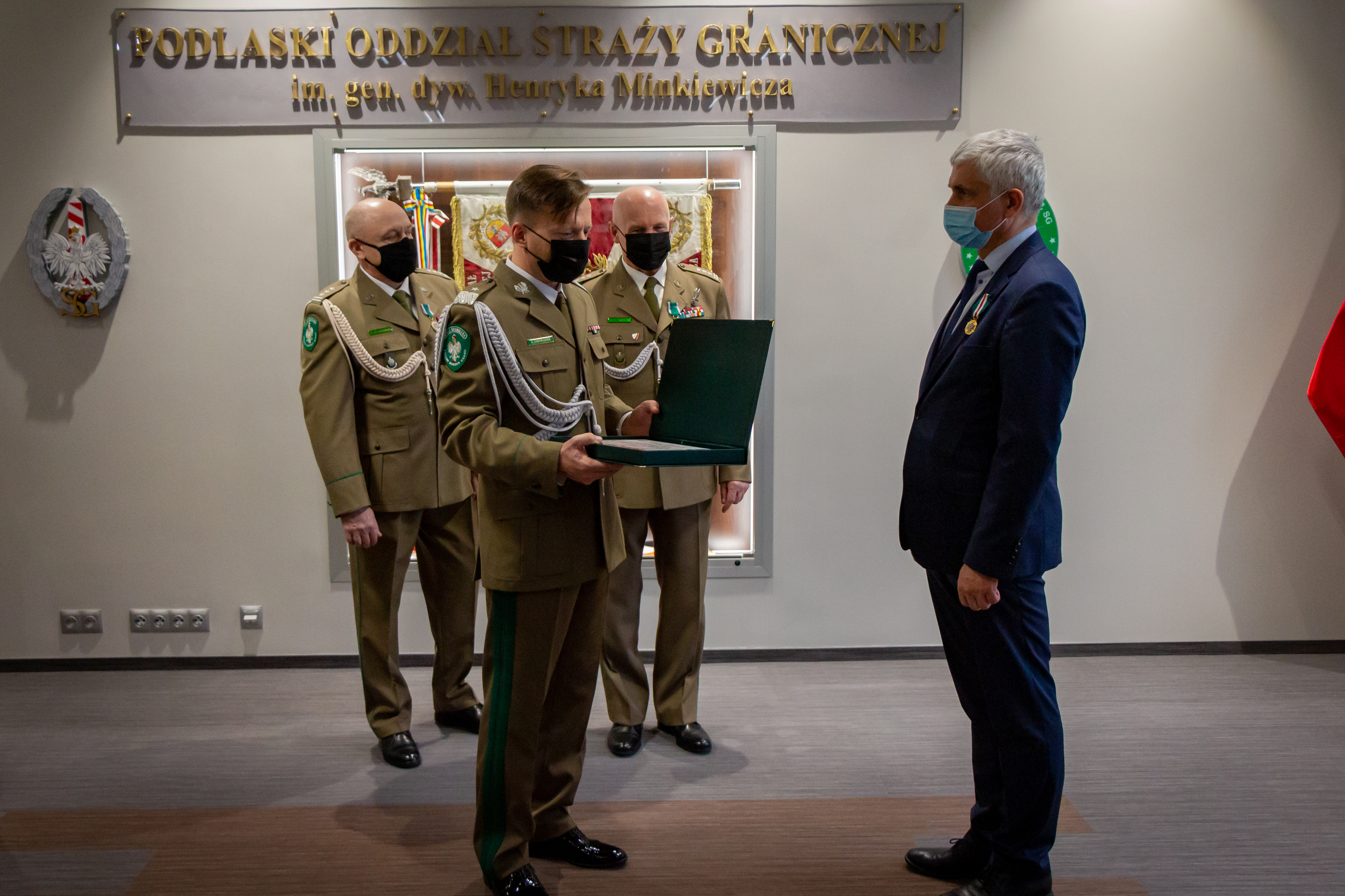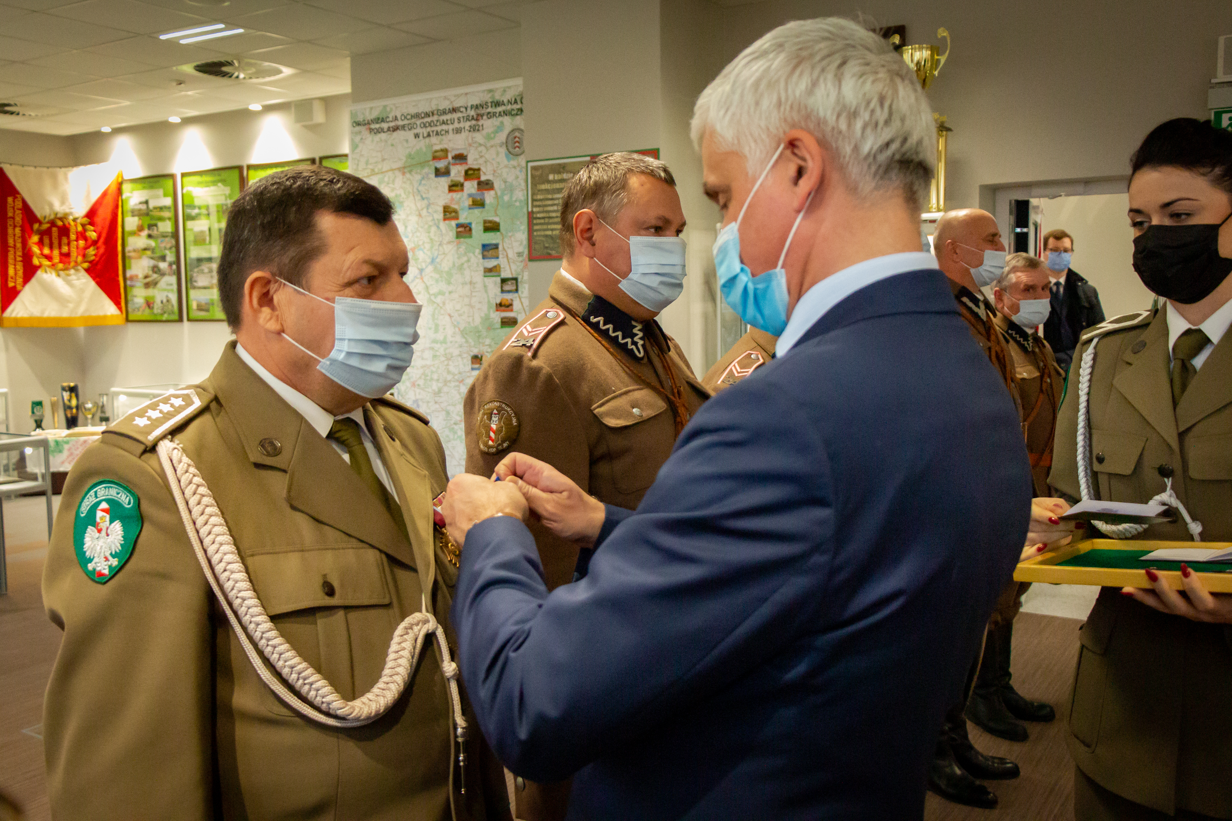 Piątkową uroczystość rozpoczął komendant Podlaskiego Oddziału Straży Granicznej gen. bryg. SG Andrzej Jakubaszek witając przybyłych gości. Pogratulował przede wszystkim wyróżnionym i jednocześnie podziękował wszystkim funkcjonariuszom i pracownikom za odpowiedzialną i rzetelną służbę i pracę, za codzienny trud i gotowość do najwyższych poświęceń. Słowa wdzięczności skierował również do służb wspierających Straż Graniczną na co dzień w bezpośredniej ochronie granicy polsko-białoruskiej.