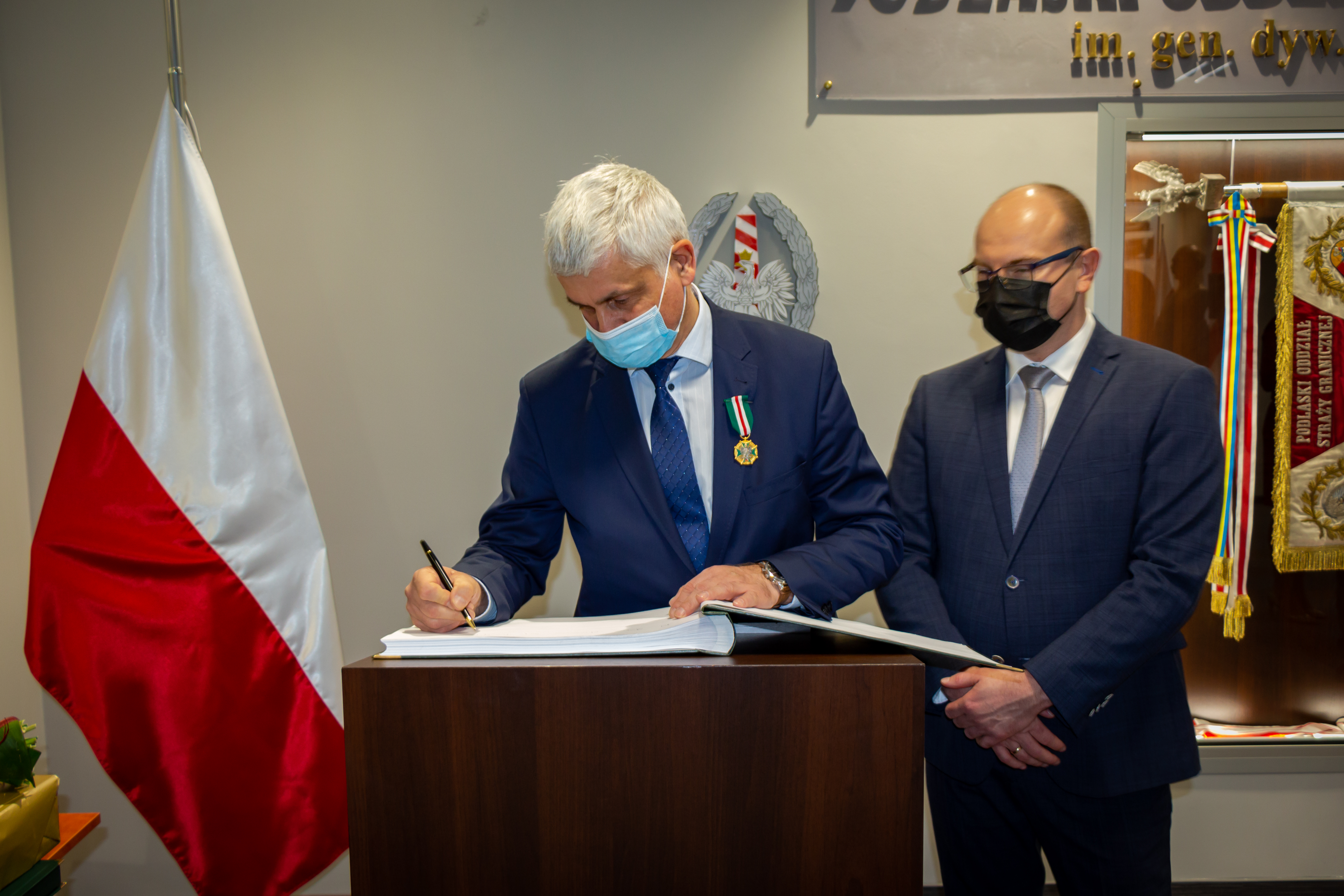- Współpraca ze Strażą Graniczą jest naszym obowiązkiem - szczególnie w zakresie tworzenia odpowiednich warunków pracy funkcjonariuszom na przejściach granicznych, ale nie tylko. Ta formacja jest ważnym ogniwem bezpieczeństwa naszego kraju. W chwili obecnej to na Straży Granicznej spoczywa jeden z głównych ciężarów odpierania agresji hybrydowej ze strony białoruskich władz. W tych działaniach również ją wspieramy - stąd też odznaczenie przyznane dziś za zasługi dla Straży Granicznej jest tym większym wyróżnieniem - mówił wojewoda podlaski Bohdan Paszkowski.