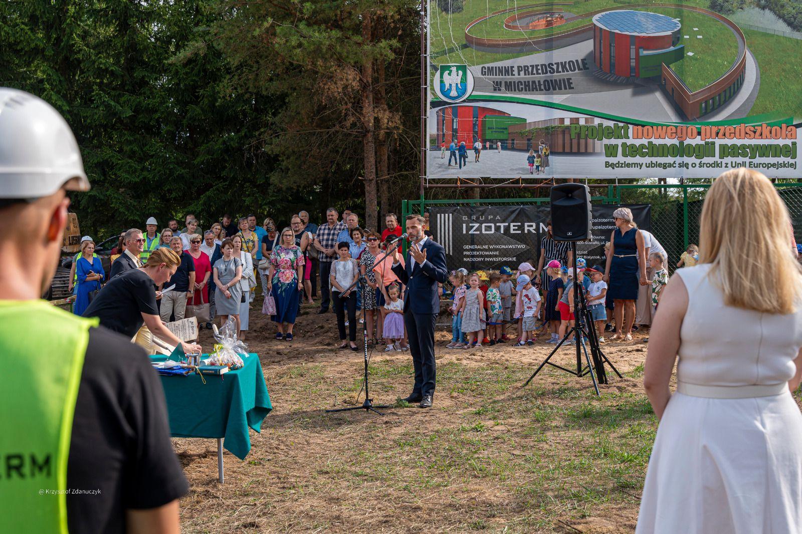 Będzie kolorowe, nowoczesne, przyjazne dla najmłodszych i ekologiczne. Samorządowe przedszkole, które powstaje w Michałowie, otoczy opieką 175 dzieci. Gmina na jego utworzenie otrzymała prawie 8 mln zł rządowego dofinansowania. W uroczystości wmurowania kamienia węgielnego wziął udział wojewoda Jacek Brzozowski.