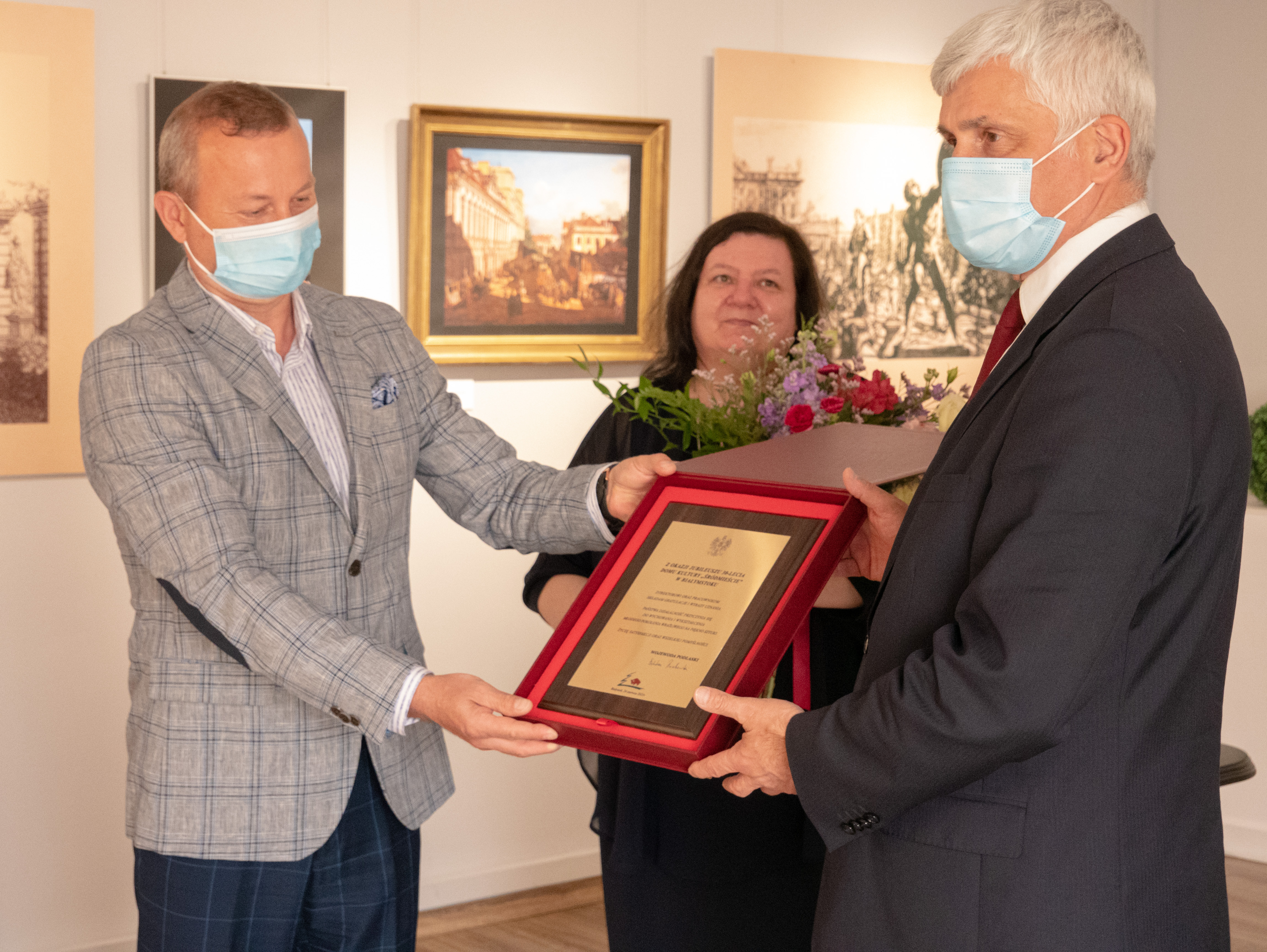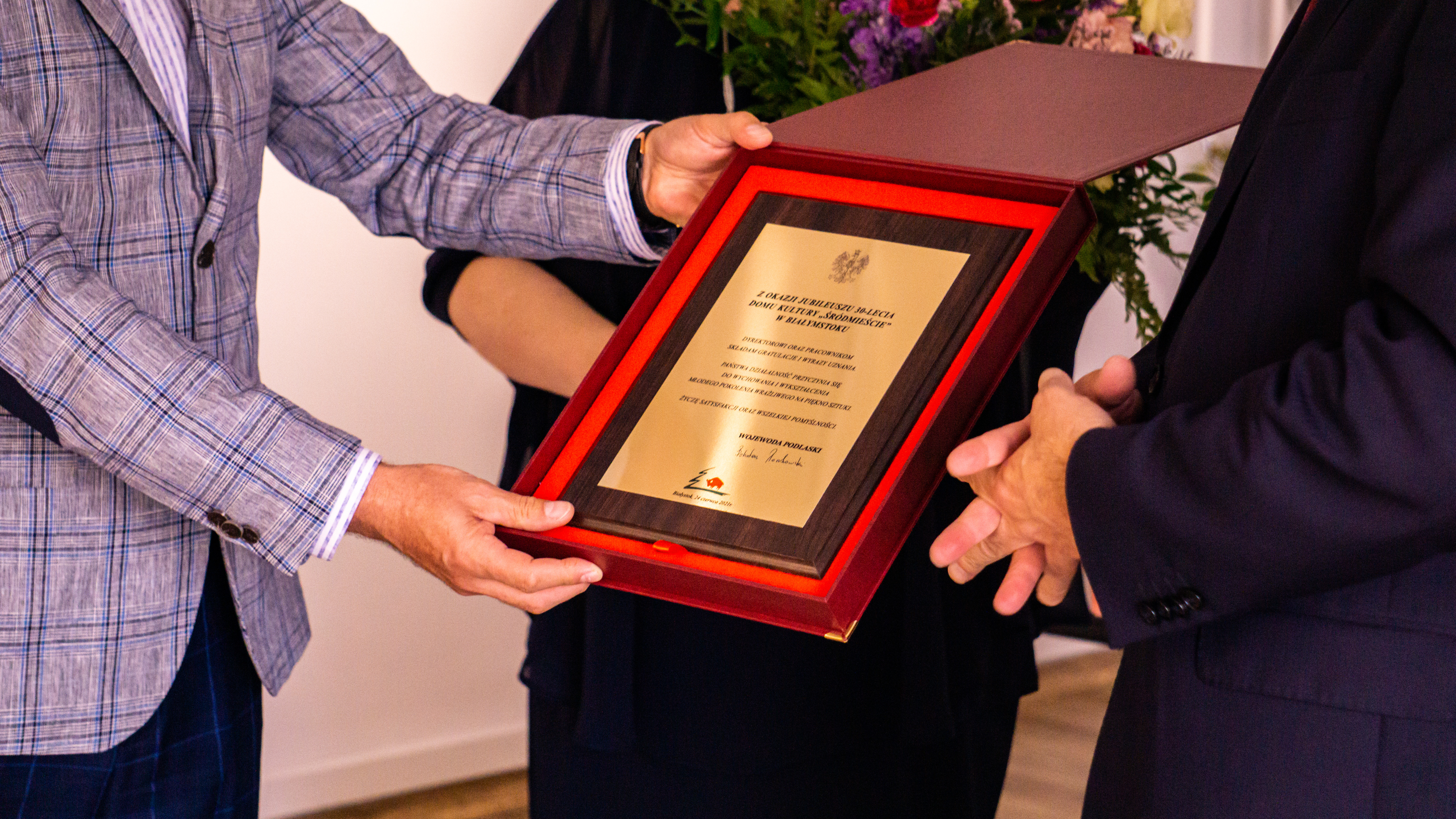 Wojewoda podlaski wręczył również dyrektorowi Wojciechowi Bokłago grawerton z okazji obchodzonego w tym roku jubileuszu 30-lecia Domu Kultury „Śródmieście” z gratulacjami, wyrazami uznania i życzeniami satysfakcji oraz wszelkiej pomyślności.
