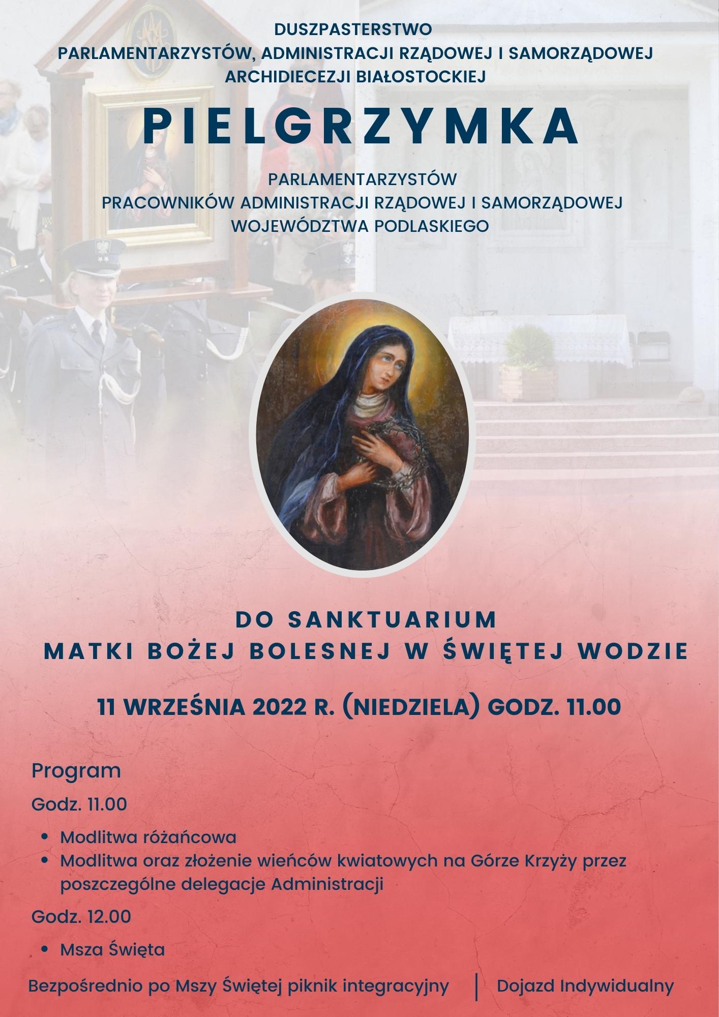 Wojewoda podlaski Bohdan Paszkowski zaprasza pracowników administracji rządowej i samorządowej województwa podlaskiego do uczestnictwa w pielgrzymce do Sanktuarium Matki Bożej Bolesnej w Świętej Wodzie, która odbędzie się w niedzielę 11 września.