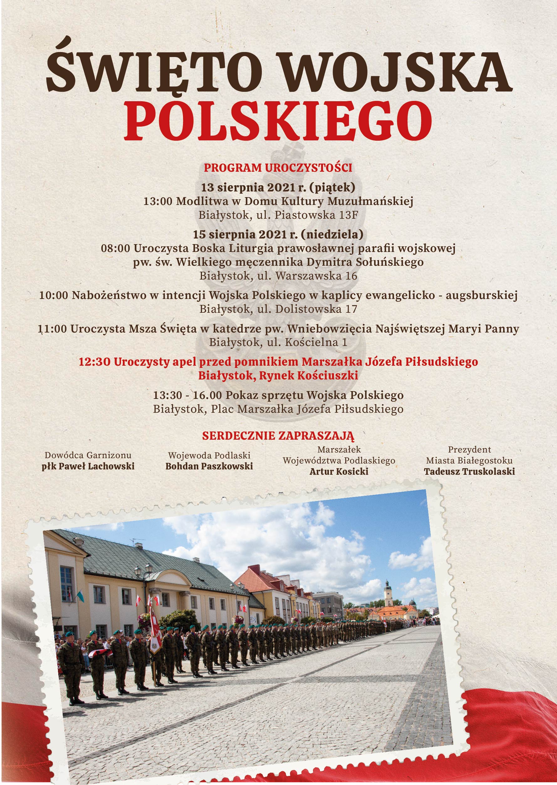 Wojewoda podlaski wraz z dowódcą Garnizonu Białystok, marszałkiem województwa podlaskiego i prezydentem Białegostoku zapraszają na wojewódzkie obchody Święta Wojska Polskiego, ustanowionego na pamiątkę Bitwy Warszawskiej z 1920 roku, zwanej „Cudem nad Wisłą”.