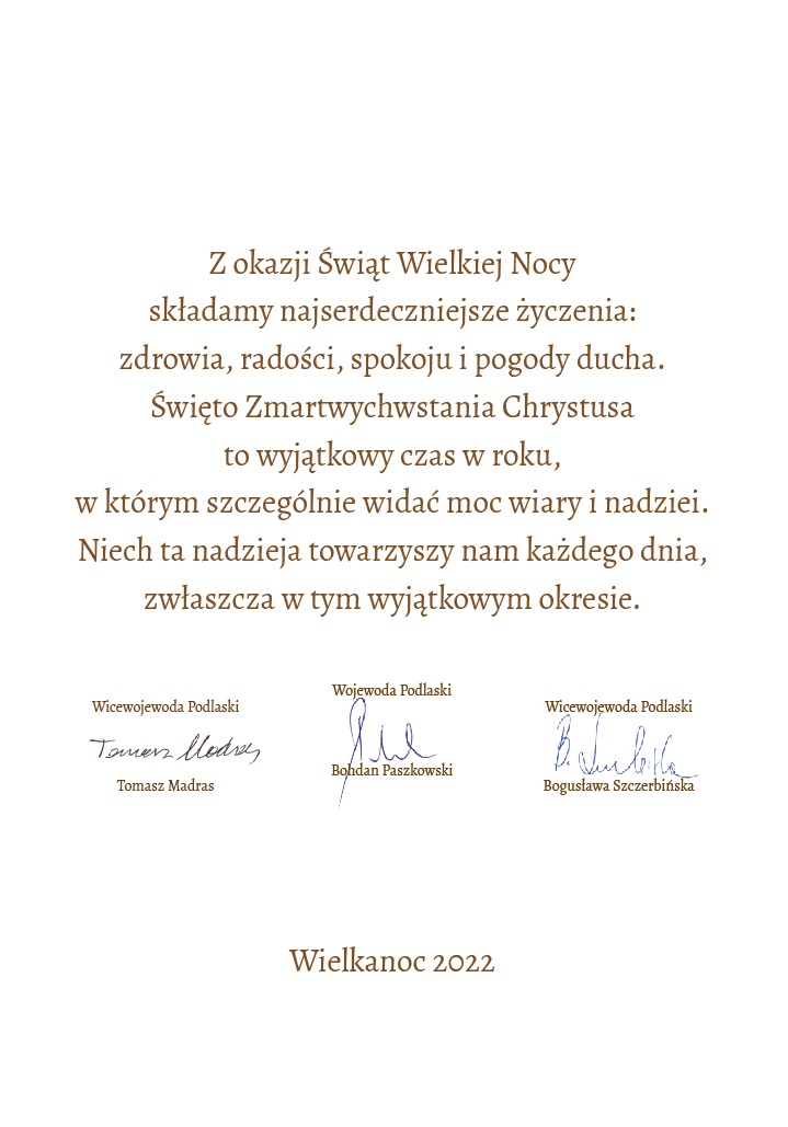 Wojewoda podlaski Bohdan Paszkowski oraz wicewojewodowie Tomasz Madras i Bogusława Szczerbińska składają najlepsze życzenia wszystkim prawosławnym mieszkańcom województwa podlaskiego z okazji Świąt Wielkiej Nocy.