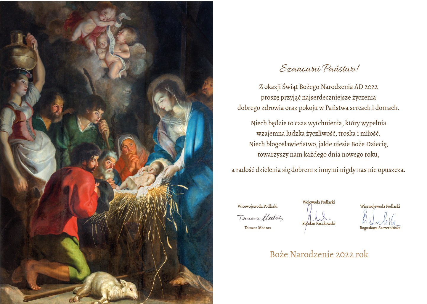 Wojewoda podlaski Bohdan Paszkowski oraz wicewojewodowie: Tomasz Madras i Bogusława Szczerbińska składają wszystkim mieszkańcom województwa podlaskiego najlepsze życzenia z okazji Świąt Bożego Narodzenia: