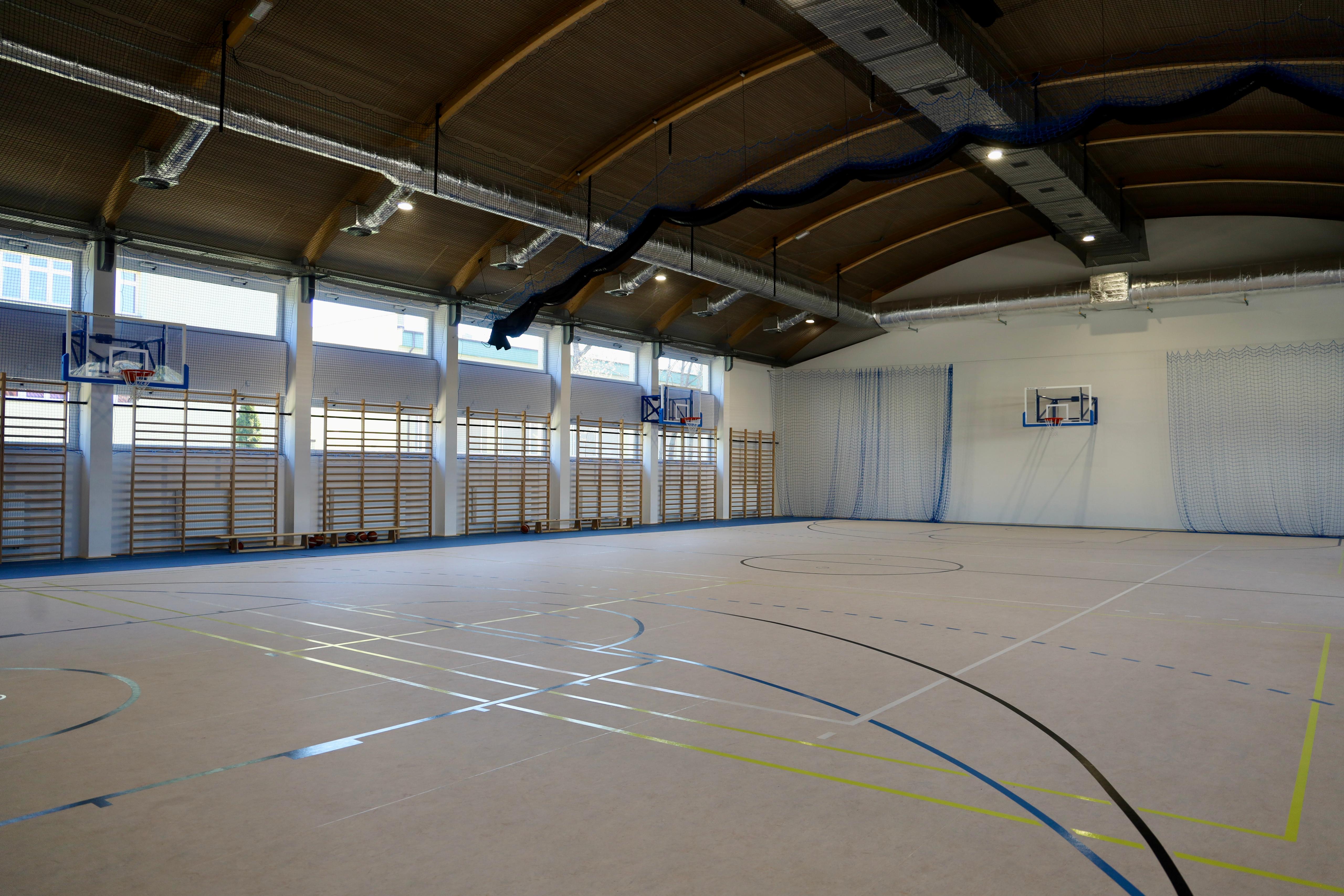 - dwa wejścia: główne (łącznik ze szkołą), zewnętrzne, pełniące rolę wyjścia ewakuacyjnego.