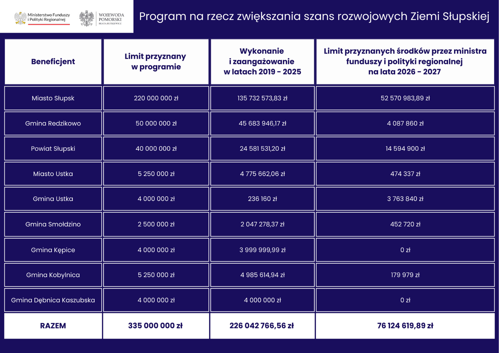 Budżet programu, którego podstawowym założeniem była poprawa jakości życia mieszkańców regionu słupskiego i zwiększenie możliwości rozwojowych, zaplanowano na 115 mln zł. Obecnie, kwota ta wzrosła do 335 mln zł. Do wykorzystania w latach 2026/2027 pozostaje 76 mln zł.