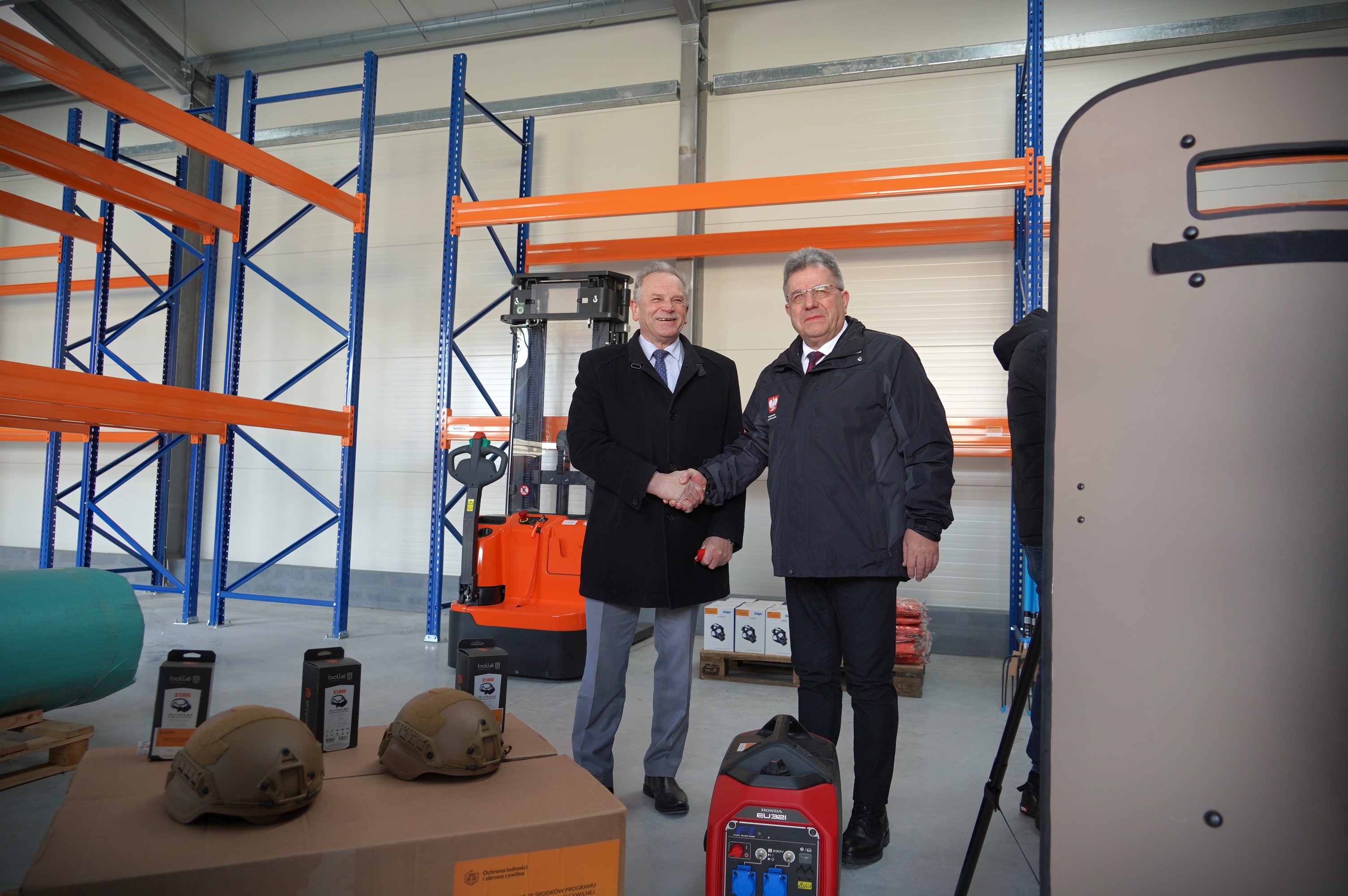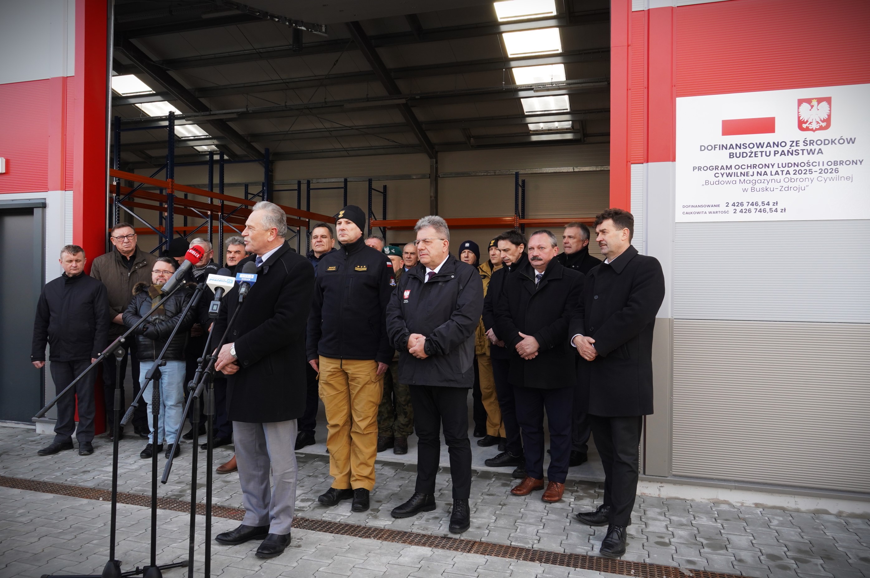 - Udało nam się w 2025 szybko wykonać projekt, stąd mogliśmy aplikować o pieniądze. Magazyn powstał szybko, dziś znajduje się już w nim sprzęt ratowniczy – mówił starosta buski Jerzy Kolarz. Dodał, że powiat jest przygotowany do wnioskowania w tym roku o rządowe środki na budowę miejsca tymczasowego schronienia.