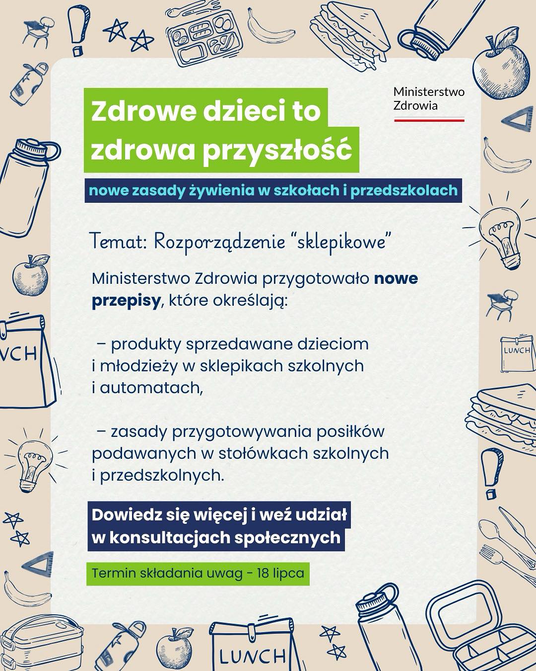 W Ministerstwie Zdrowia trwają prace nad nowymi przepisami dotyczącymi żywienia dzieci i młodzieży w przedszkolach i szkołach. Celem tzw. „rozporządzenia sklepikowego” jest wzmocnienie ochrony zdrowia dzieci i młodzieży poprzez ograniczenie dostępu do produktów zawierających duże ilości cukru, soli i tłuszczu oraz wskazanie zasad prawidłowego komponowania posiłków.