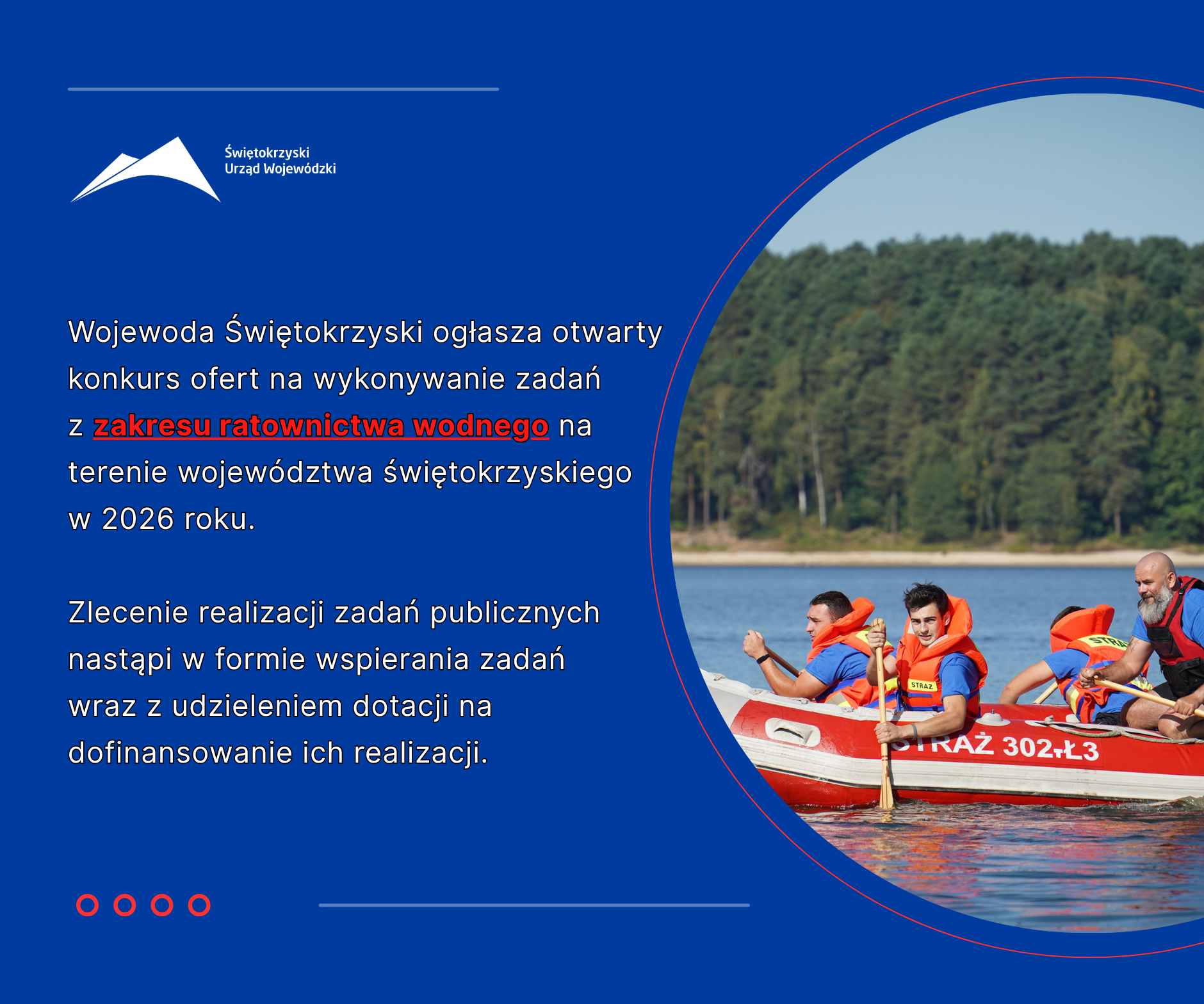Wojewoda Świętokrzyski ogłasza otwarty konkurs na wykonywanie zadań publicznych z zakresu ratownictwa wodnego na terenie województwa świętokrzyskiego w 2026 roku.