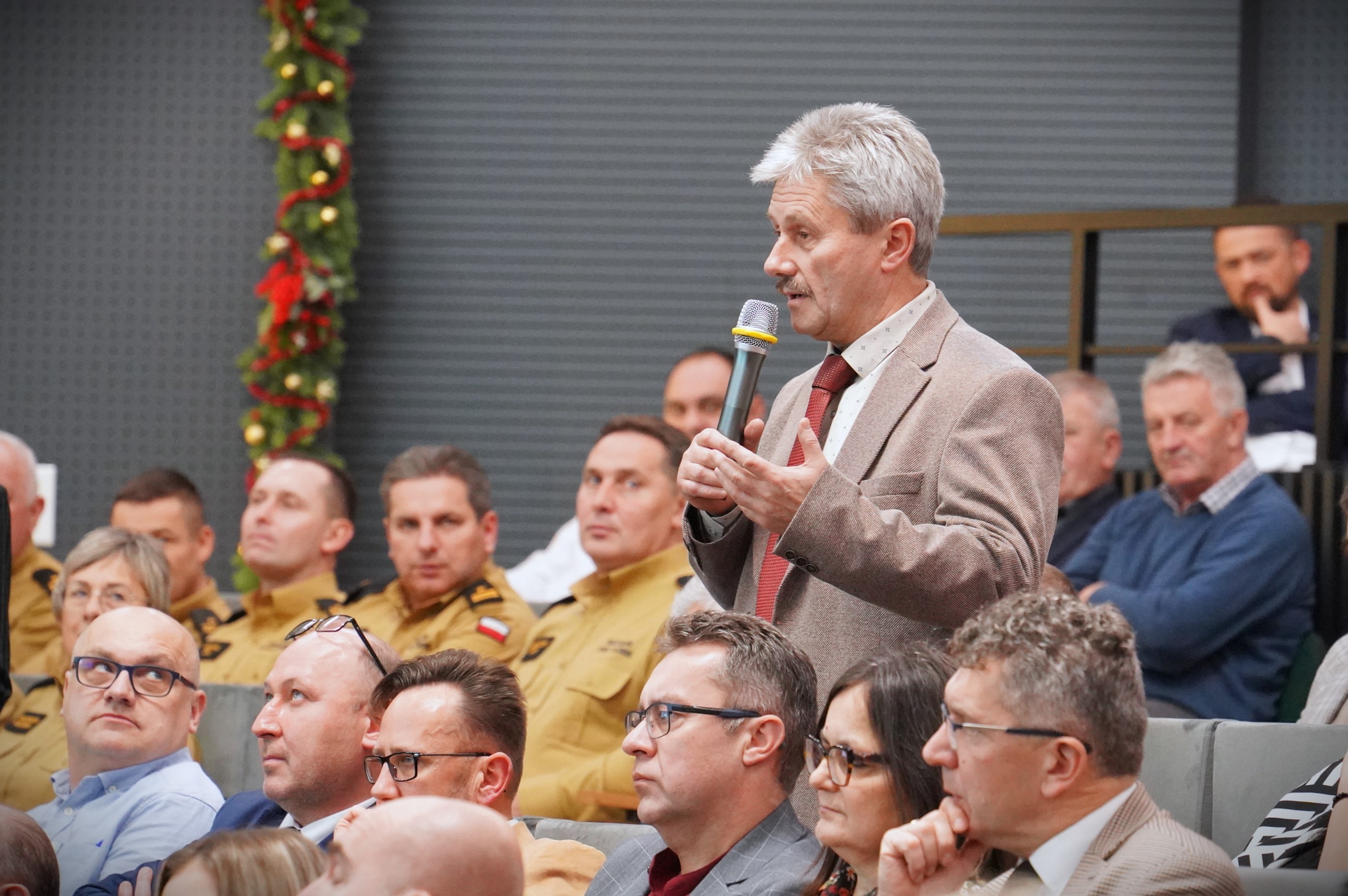 Wiceminister Leśniakiewicz odpowiadał także na pytania samorządowców. Poruszano kwestie związane m.in. z inwestycjami wieloletnimi w ramach programu ochrony ludności, poszerzeniem katalogu zadań, jaki program może obejmować, dofinansowaniem budowy miejsc doraźnego schronienie w budynkach użyteczności publicznej czy też budową magazynów obrony cywilnej.