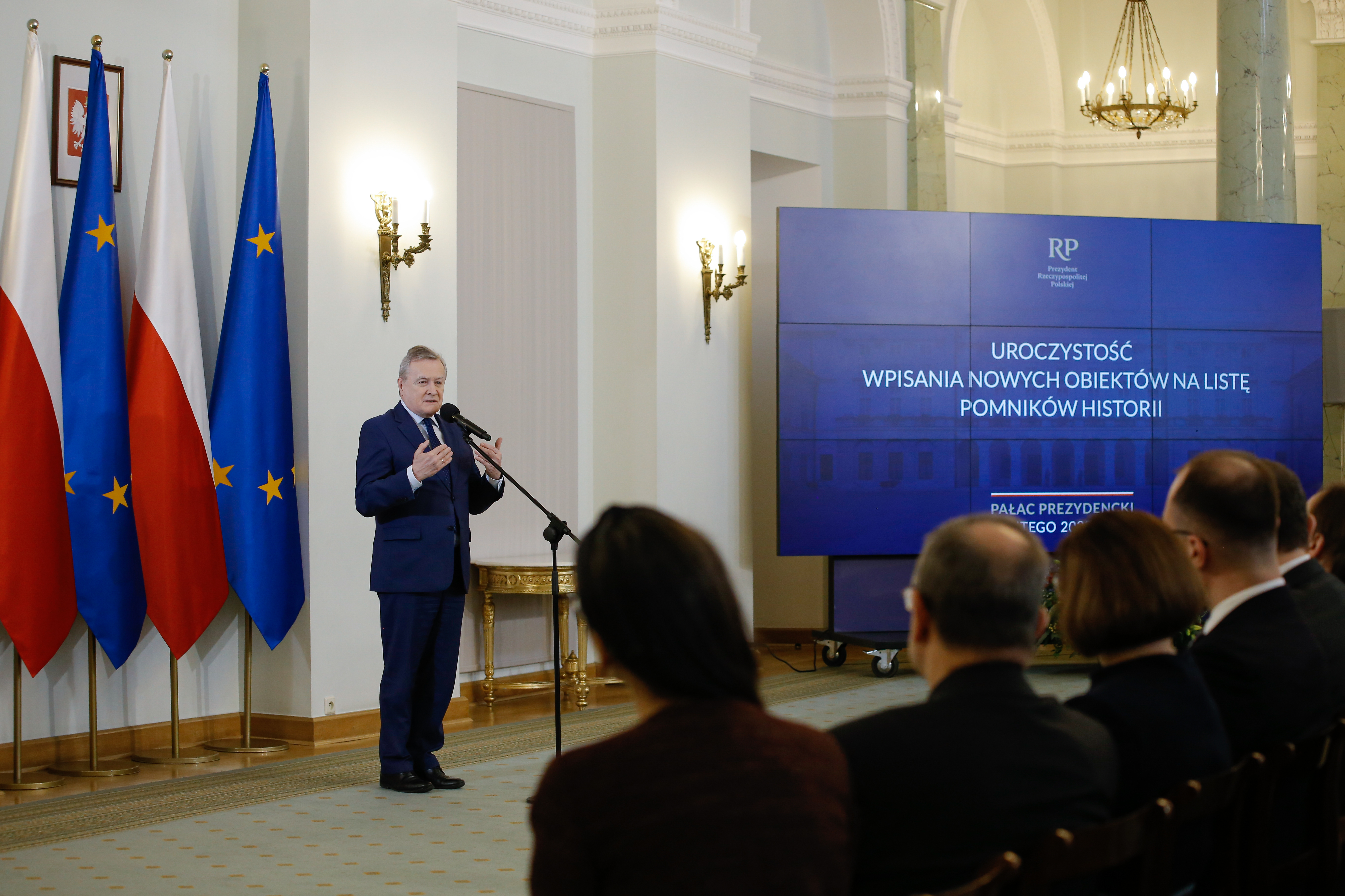 „Proces nadawania ważnym miejscom zabytkowym w Polsce tytułu Pomnika Historii wpisuje się w szerszą politykę ostatnich lat - politykę szczególnej dbałości o polską kulturę, tożsamość, historię, całą politykę historyczną. To jest fakt bez precedensu – w ciągu 7 lat listę Pomników Historii zwiększyliśmy o ponad 60 wpisów i dziś na tej prestiżowej liście znajdują się 123 zabytkowe obiekty i miejsca” – powiedział wicepremier, minister kultury i dziedzictwa narodowego prof. Piotr Gliński podczas uroczystości, która dziś odbyła się w Pałacu Prezydenckim.