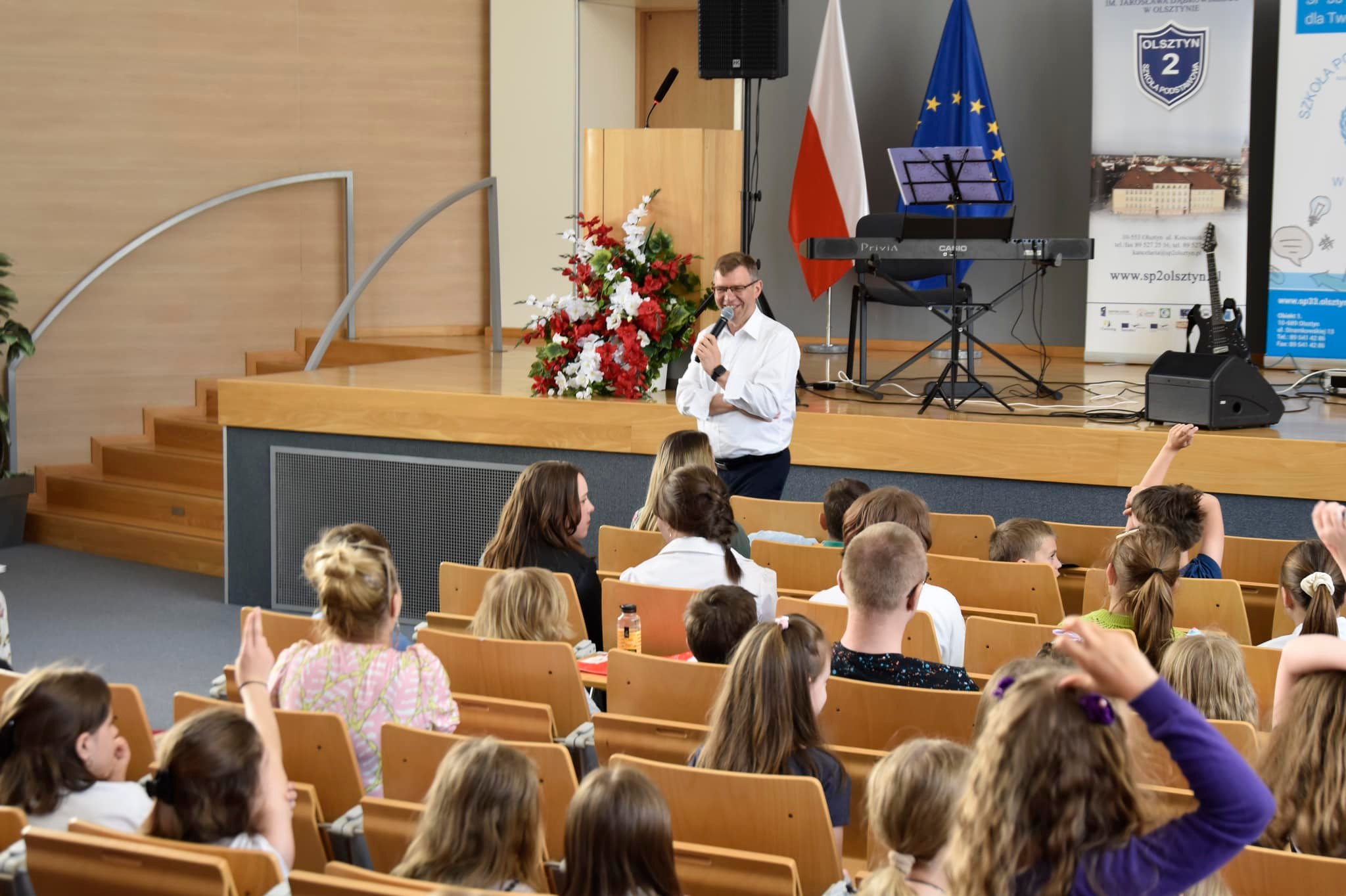 Spotkanie rozpoczęło się od pytań, które uczniowie kierowali do Wojewody. Całemu wydarzeniu towarzyszyły występy uczniów ze Szkoły Podstawowej nr 2, a także uczniów z Pałacu Młodzieży w Olsztynie. Były również akcenty hiszpańskie: występ zespołu hiszpańskiego oraz opowiadanie w tym języku.