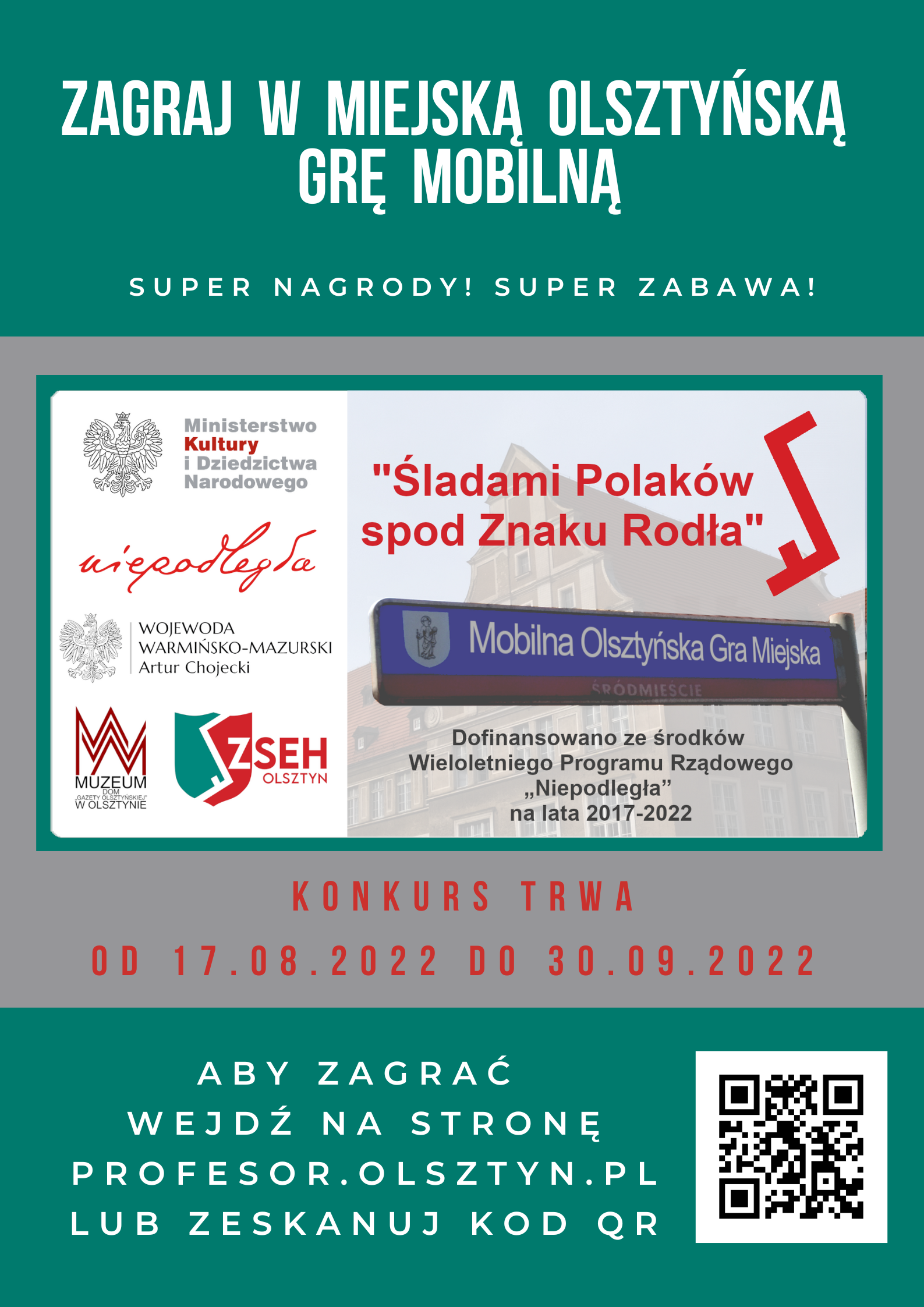 Zespół Szkół Ekonomiczno-Handlowych w Olsztynie oraz Stowarzyszenie Przyjaciół ZSEH z okazji 100-lecia powstania Związku Polaków w Niemczech stworzył Miejską Olsztyńską Grę Mobilną „Śladami Polaków spod Znaku Rodła”. Wraz z publikacją gry rusza również konkurs z atrakcyjnymi nagrodami. Wejdź na stronę http://profesor.olsztyn.pl/ lub zeskanuj kod QR. Tam tez znajdziesz „Regulamin konkursu” oraz „Instrukcję gry”.