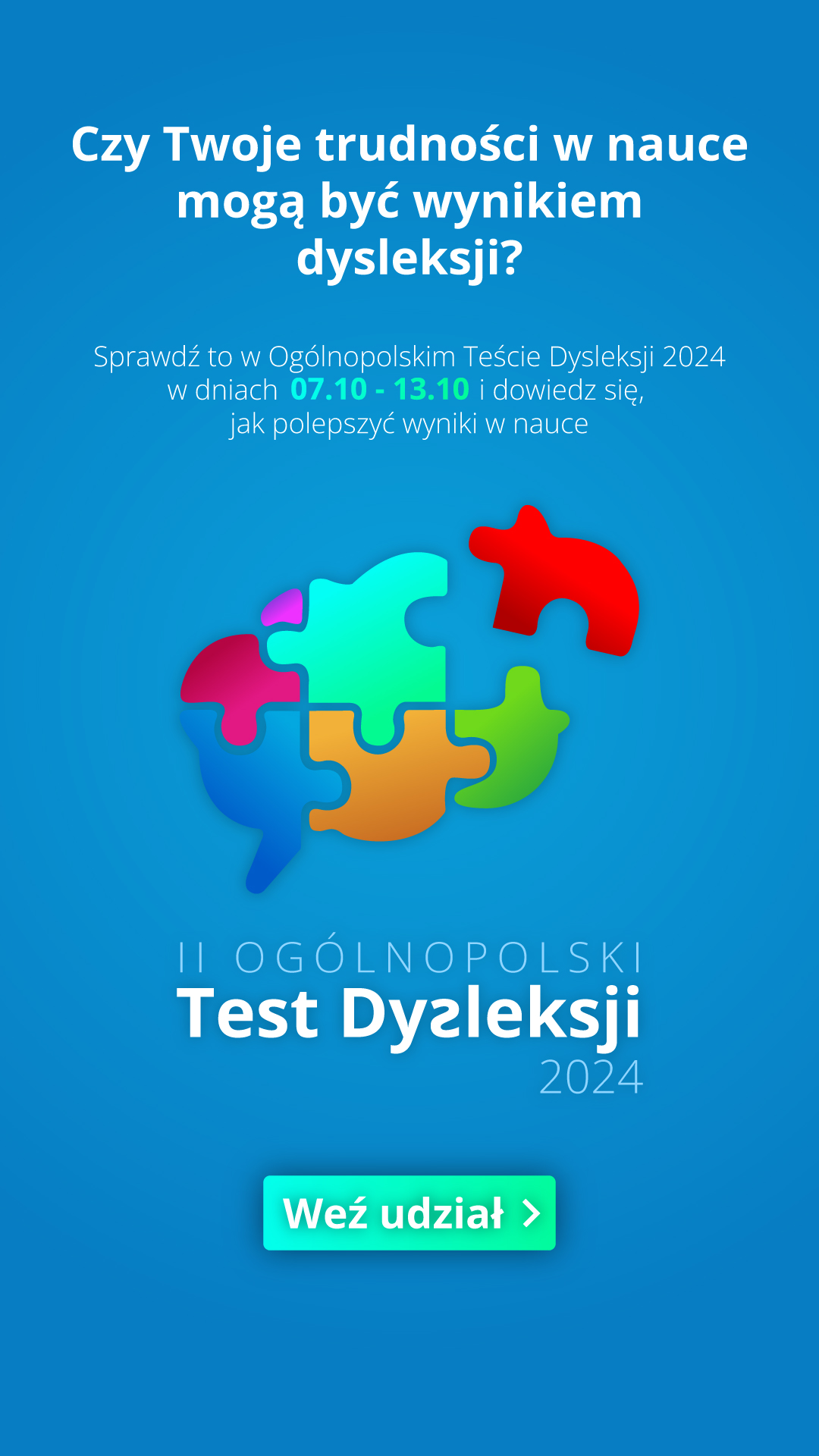 Ogromną szansą będzie II edycja Ogólnopolskiego Testu Dysleksji, dostępnego wolnego od opłat w dniach 7-13.10.2024 r. w ramach Europejskiego Tygodnia Świadomości Dysleksji. Wystarczy zainstalować aplikację ZDAY lub zalogować się przez przeglądarkę. Rozwiązanie testu zajmuje około 10-15 minut, a uczeń natychmiast pozna swój wynik. Projekt realizowany jest pod patronatem Akademii Humanitas.