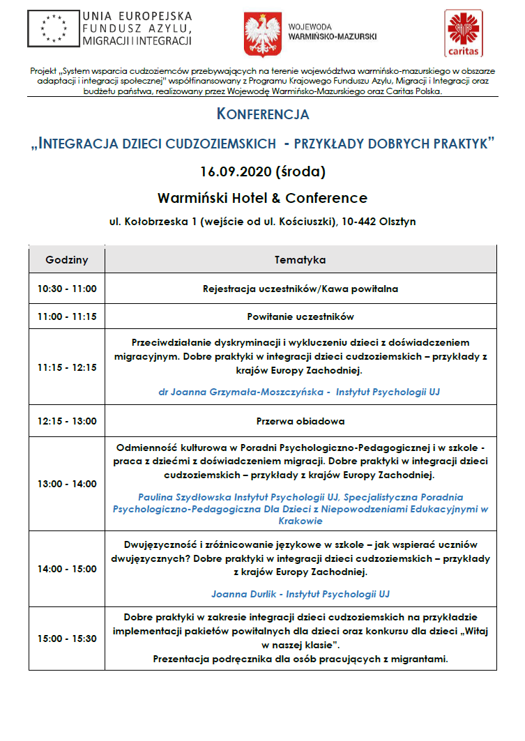 Jednym z realizowanych działań w ramach projektu jest konferencja na temat dobrych praktyk w integracji dzieci cudzoziemskich. W załączniku przekazujmy program konferencji, która zaplanowana jest 16 września 2020 r. w Olsztynie w hotelu Warmiński Hotel & Conference.