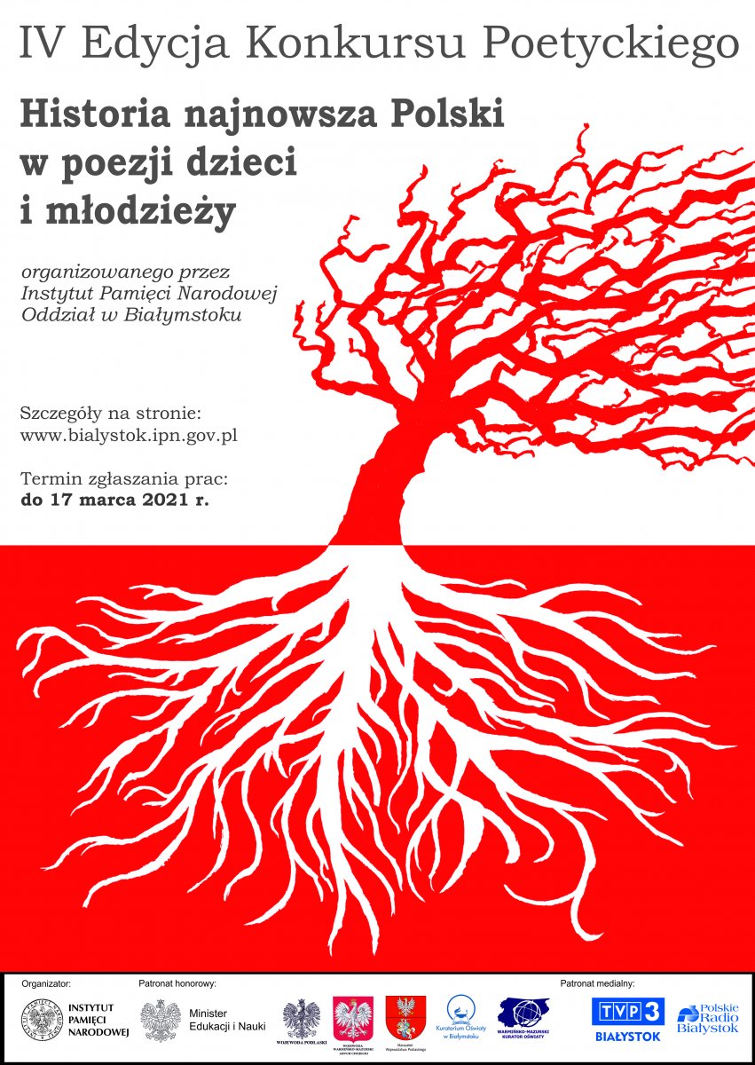 Oddział Instytutu Pamięci Narodowej w Białymstoku już po raz czwarty serdecznie zaprasza uczniów klas IV – VIII szkół podstawowych, szkół ponadpodstawowych województwa podlaskiego, województwa warmińsko-mazurskiego oraz dzieci i młodzież, w szczególności pochodzenia polskiego, mieszkającą poza granicami kraju do udziału w konkursie poetyckim „Historia najnowsza Polski w poezji dzieci i młodzieży”.