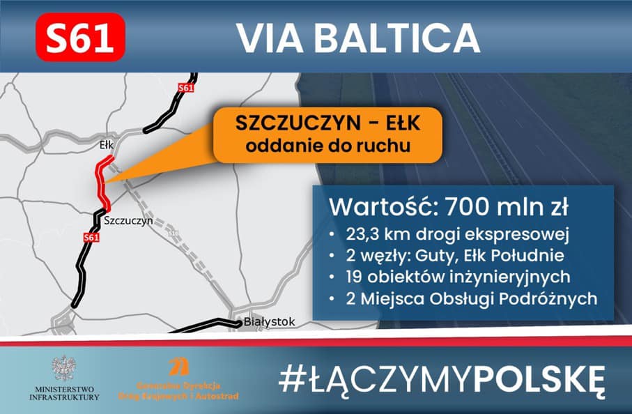 13 września 2022 r. został oddany do ruchu 23,3 km odcinek drogi ekspresowej S61 Szczuczyn – Ełk Południe. To drugi z trzech odcinków S61 realizowanych na terenie województwa warmińsko-mazurskiego, który został zakończony. Na początku roku oddany do użytku został odcinek Wysokie – Raczki, a w przyszłym roku zakończy się budowa odcinka S61 Ełk Południe – Wysokie.