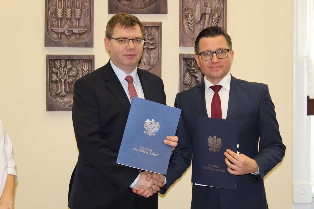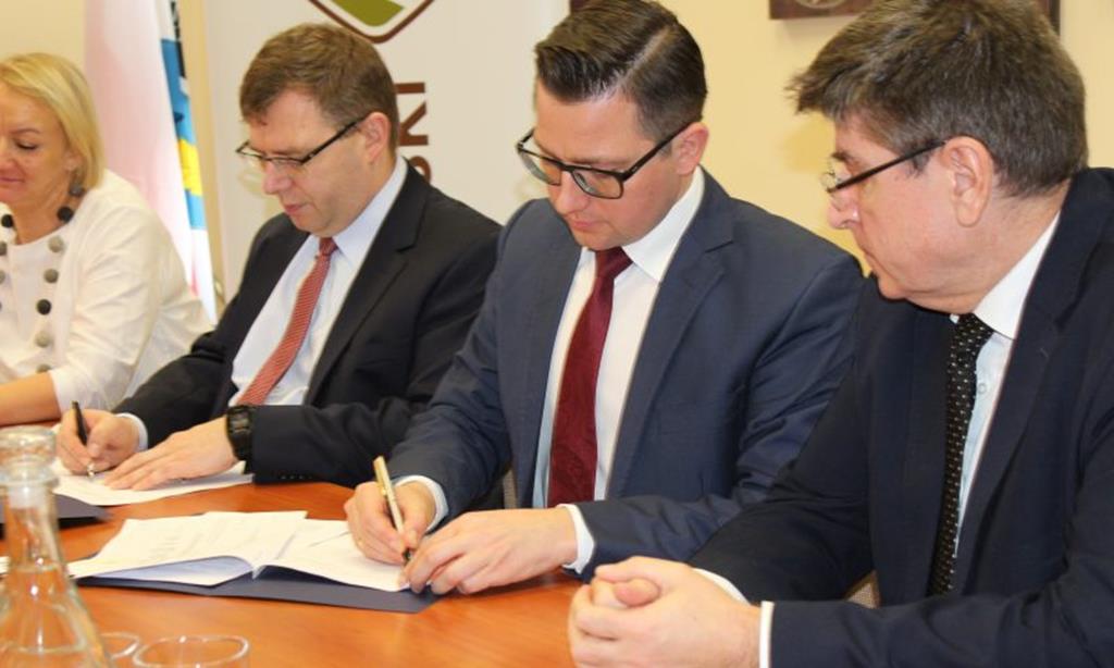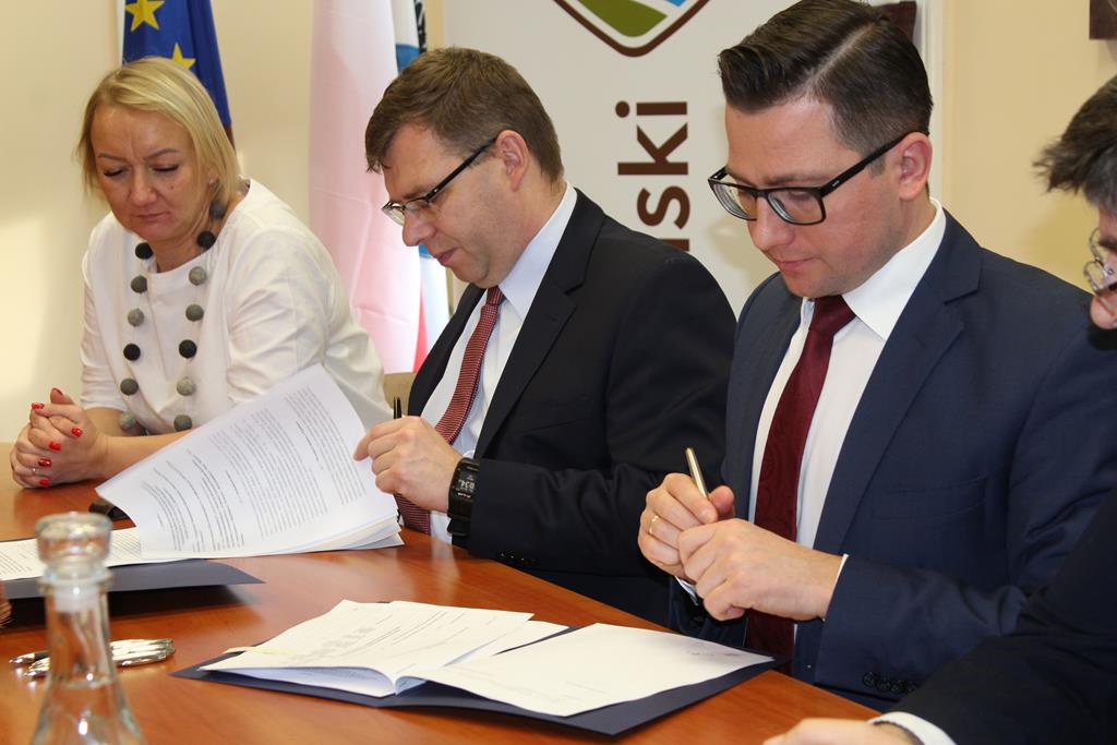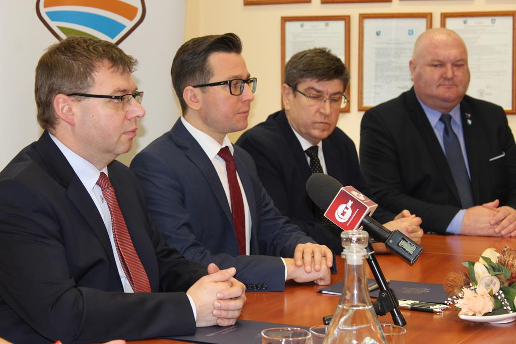 W uroczystym podpisaniu umowy uczestniczyli: Starosta Kętrzyński Michał Kochanowski, Członek Zarządu Powiatu Zdzisław Flis, Wójt Gminy Barciany Marta Kamińska oraz Wójt Gminy Srokowo Marek Olszewski.