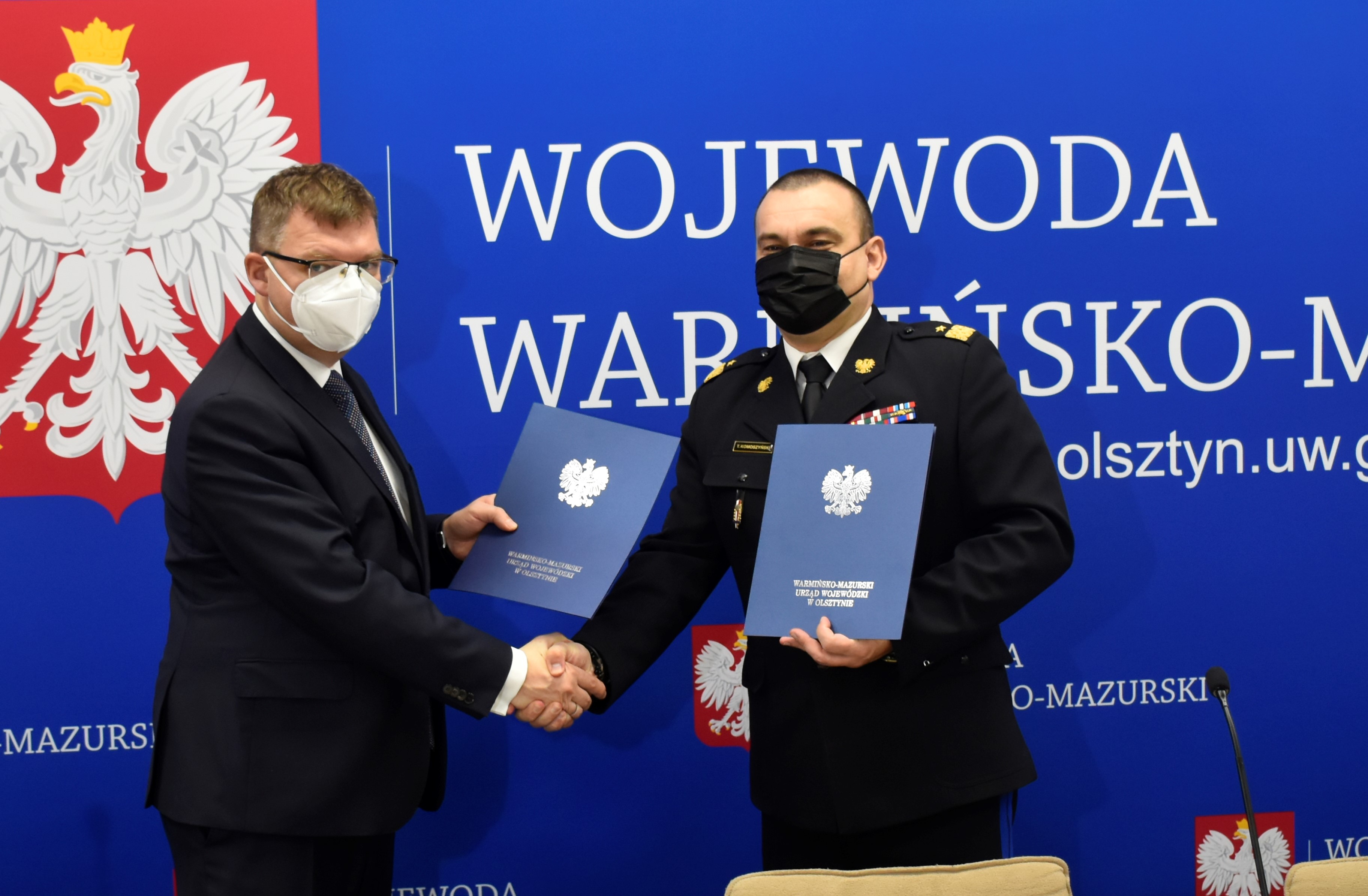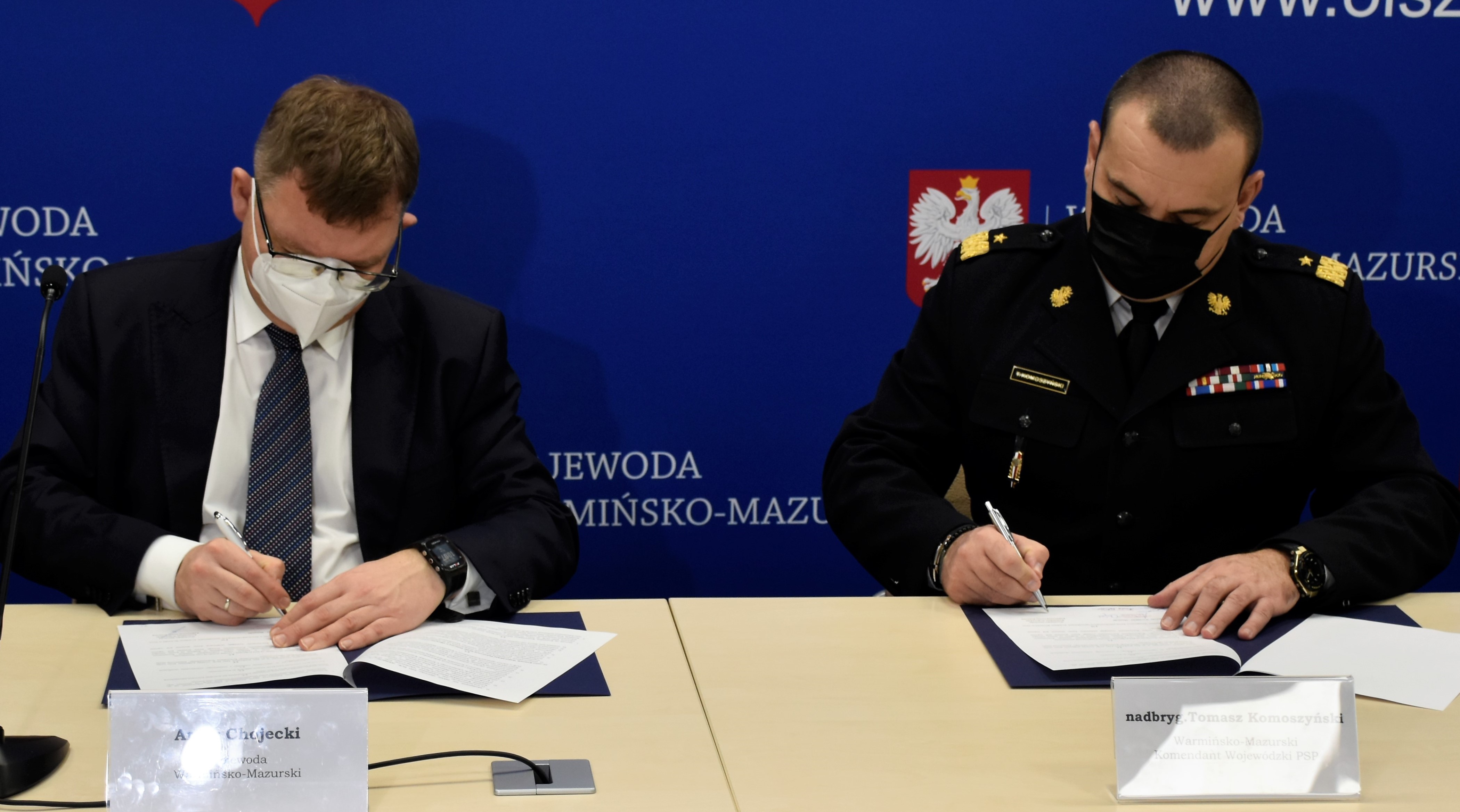 Dziś w Urzędzie Wojewódzkim odbyło się podpisanie porozumienia pomiędzy Wojewodą Warmińsko-Mazurskim Arturem Chojeckim a Warmińsko-Mazurskim Komendantem Wojewódzkim Państwowej Straży Pożarnej nadbryg. Tomaszem Komoszyńskim dotyczącego współpracy w zakresie wdrożenia, utrzymania i rozwoju Systemu Elektronicznego Zarządzania Dokumentacją.