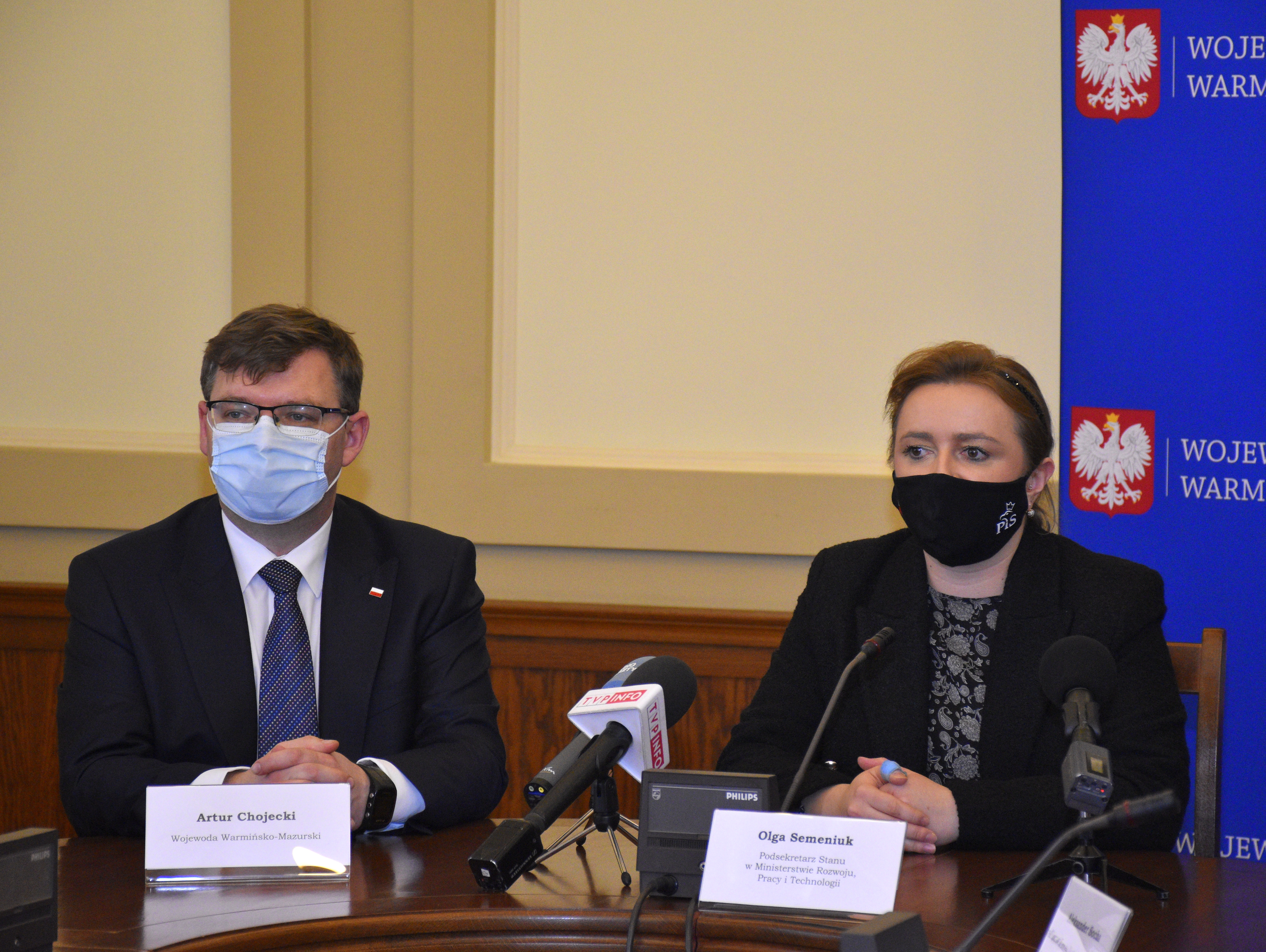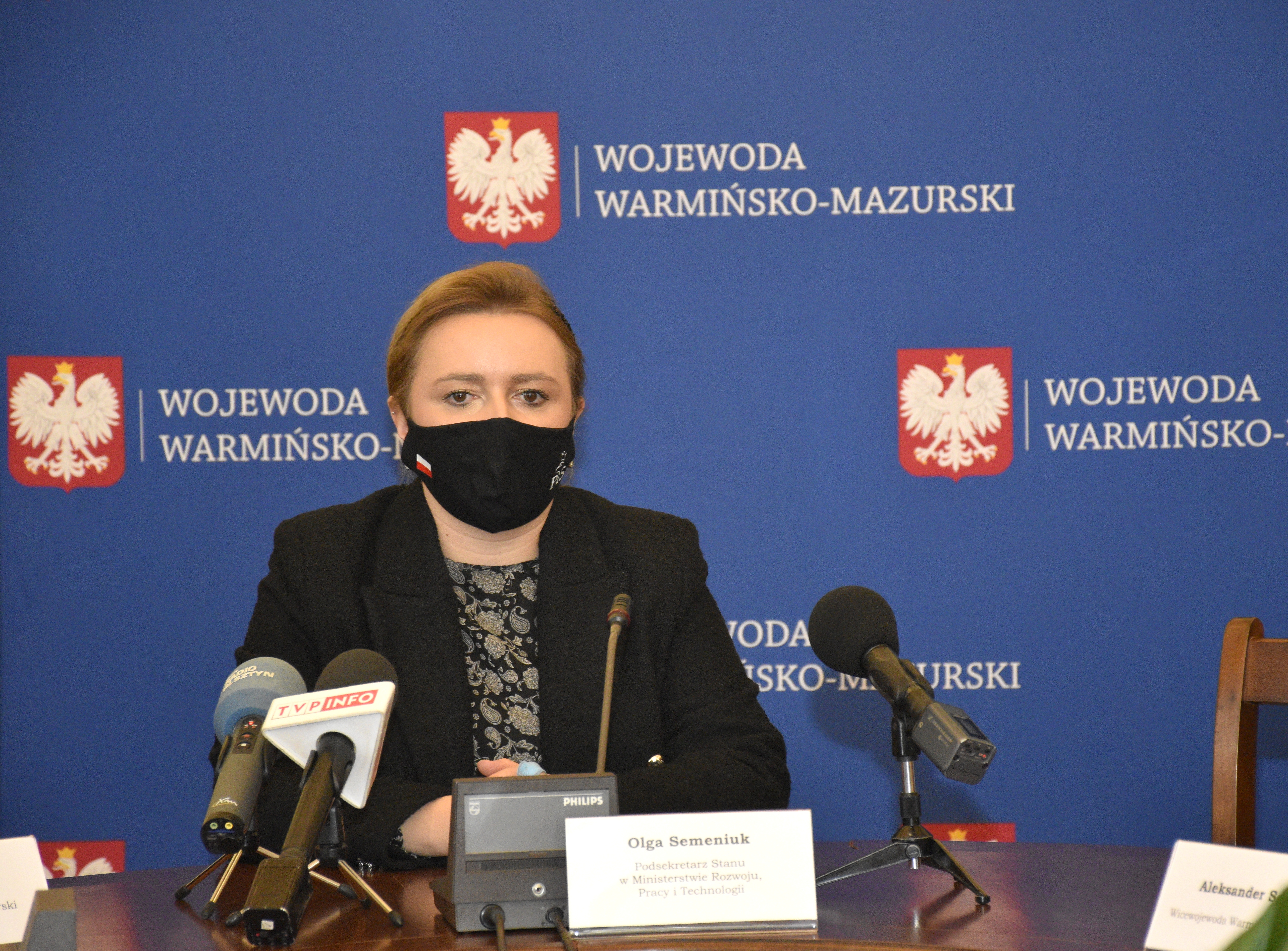 Dziś województwo warmińsko-mazurskie odwiedziła Podsekretarz Stanu w Ministerstwie Rozwoju, Pracy i Technologii Olga Semeniuk. Głównym tematem jej wizyty było podsumowanie dotychczasowych rezultatów Tarczy Branżowej i Tarczy Finansowej 2.0. W konferencji prasowej razem z panią minister udział wzięli: wojewoda Artur Chojecki, poseł Wojciech Kossakowski, wicewojewoda Aleksander Socha oraz Jerzy Gosiewski.