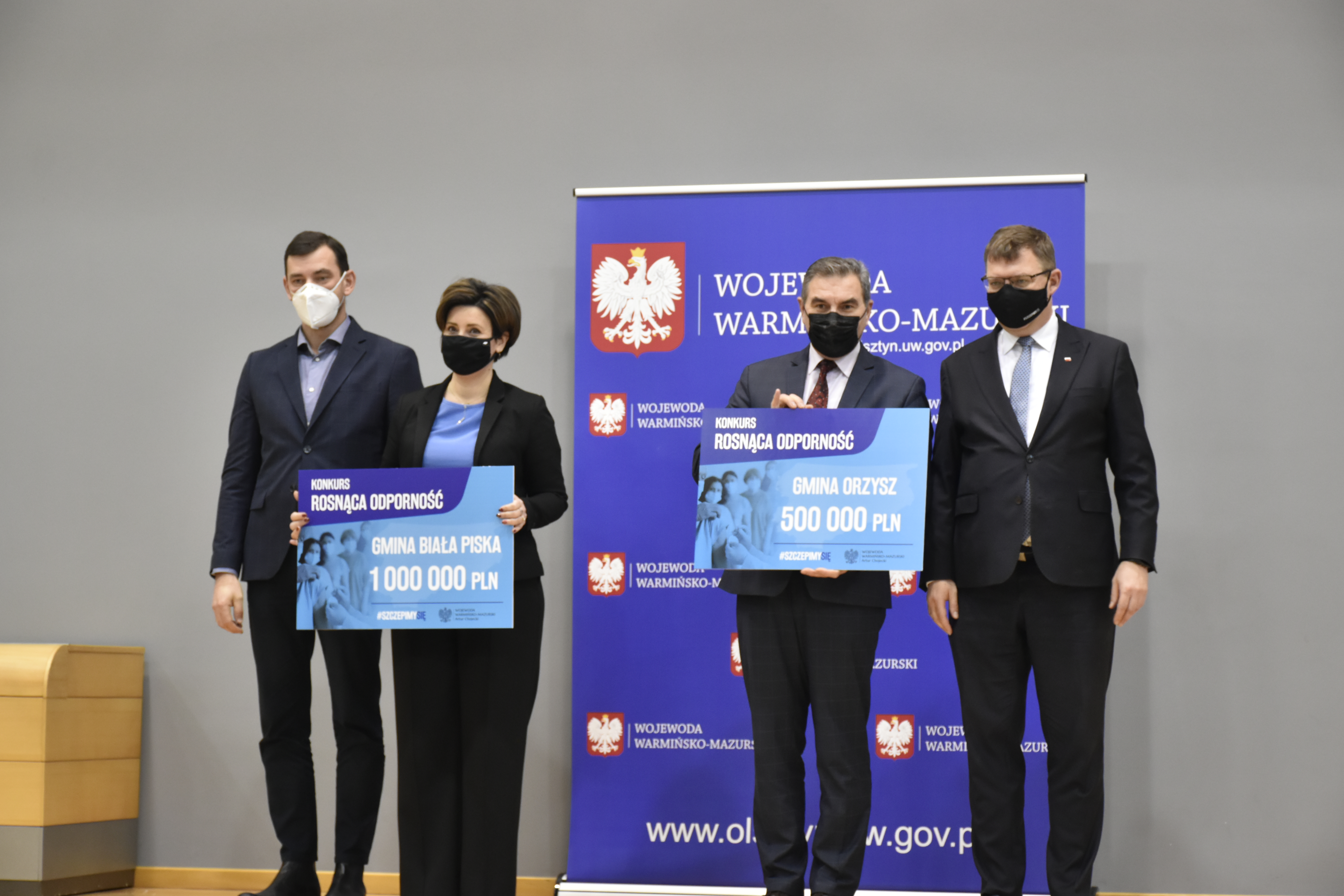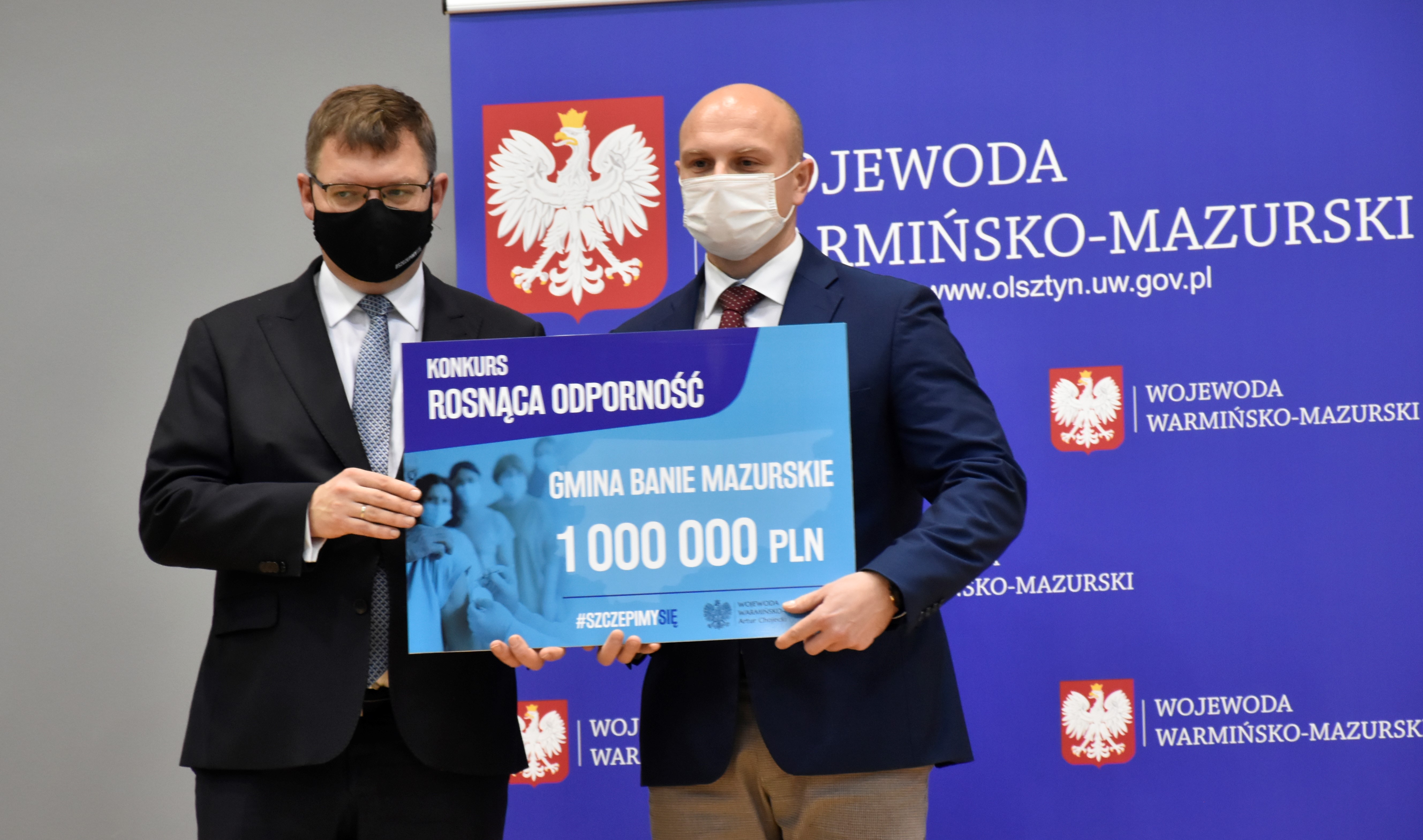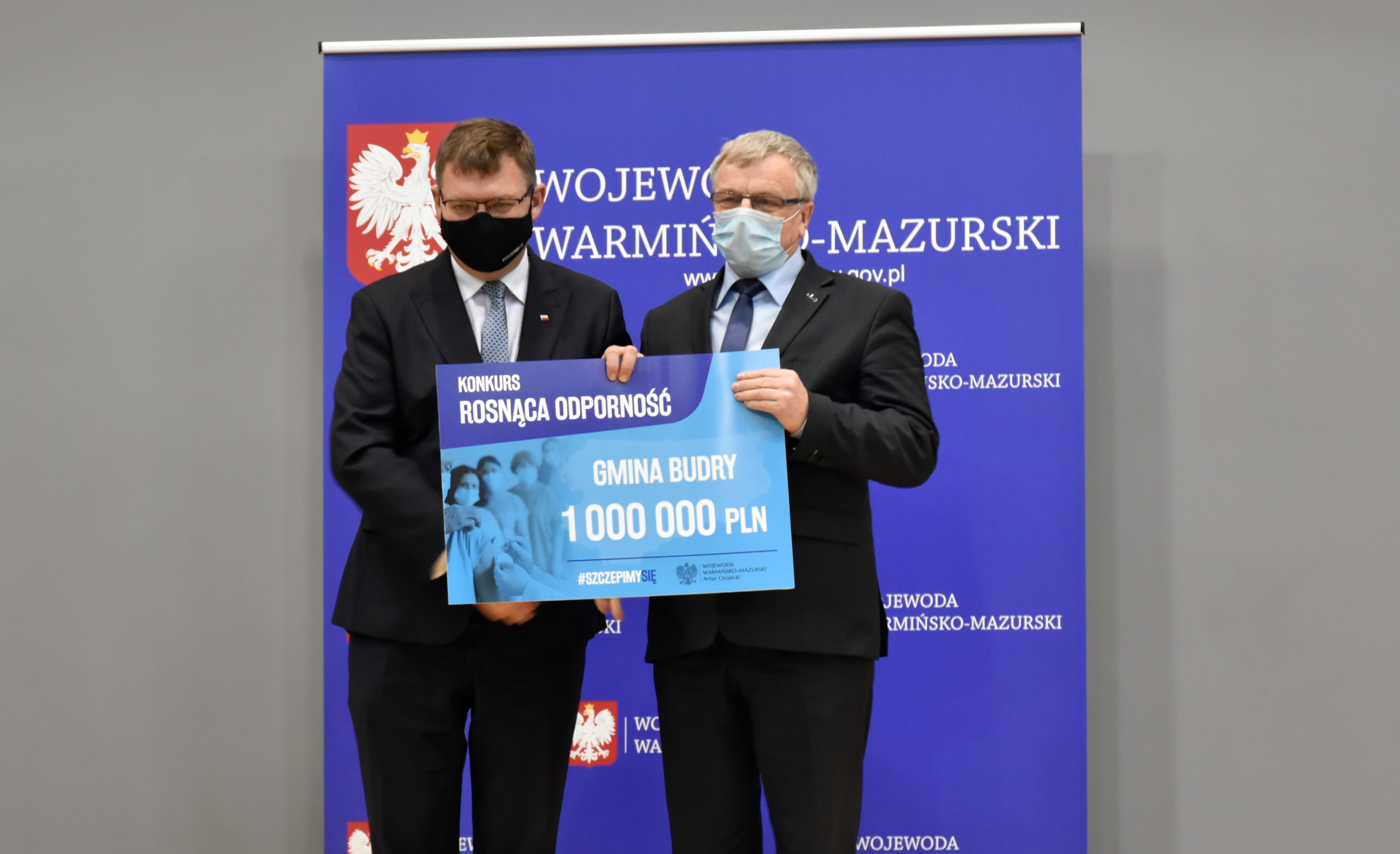 Wojewoda Warmińsko-Mazurski Artur Chojecki i Dyrektor Wydziału Bezpieczeństwa i Zarządzania Kryzysowego Krzysztof Kuriata wręczyli czeki przedstawicielom gmin, które zostały nagrodzone w Konkursie Rosnąca odporność. W naszym województwie 50 gmin otrzymało w sumie 31 milionów złotych.