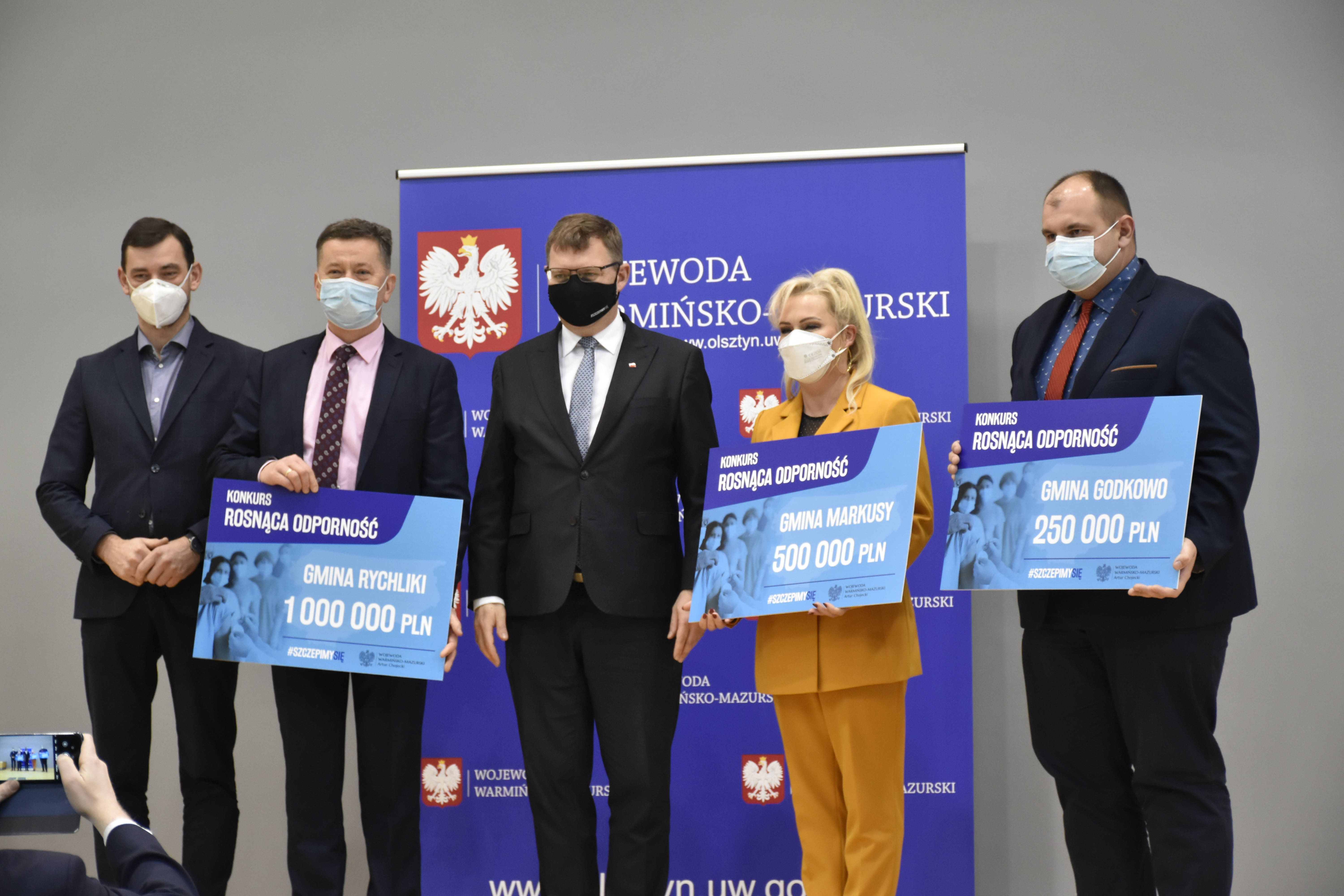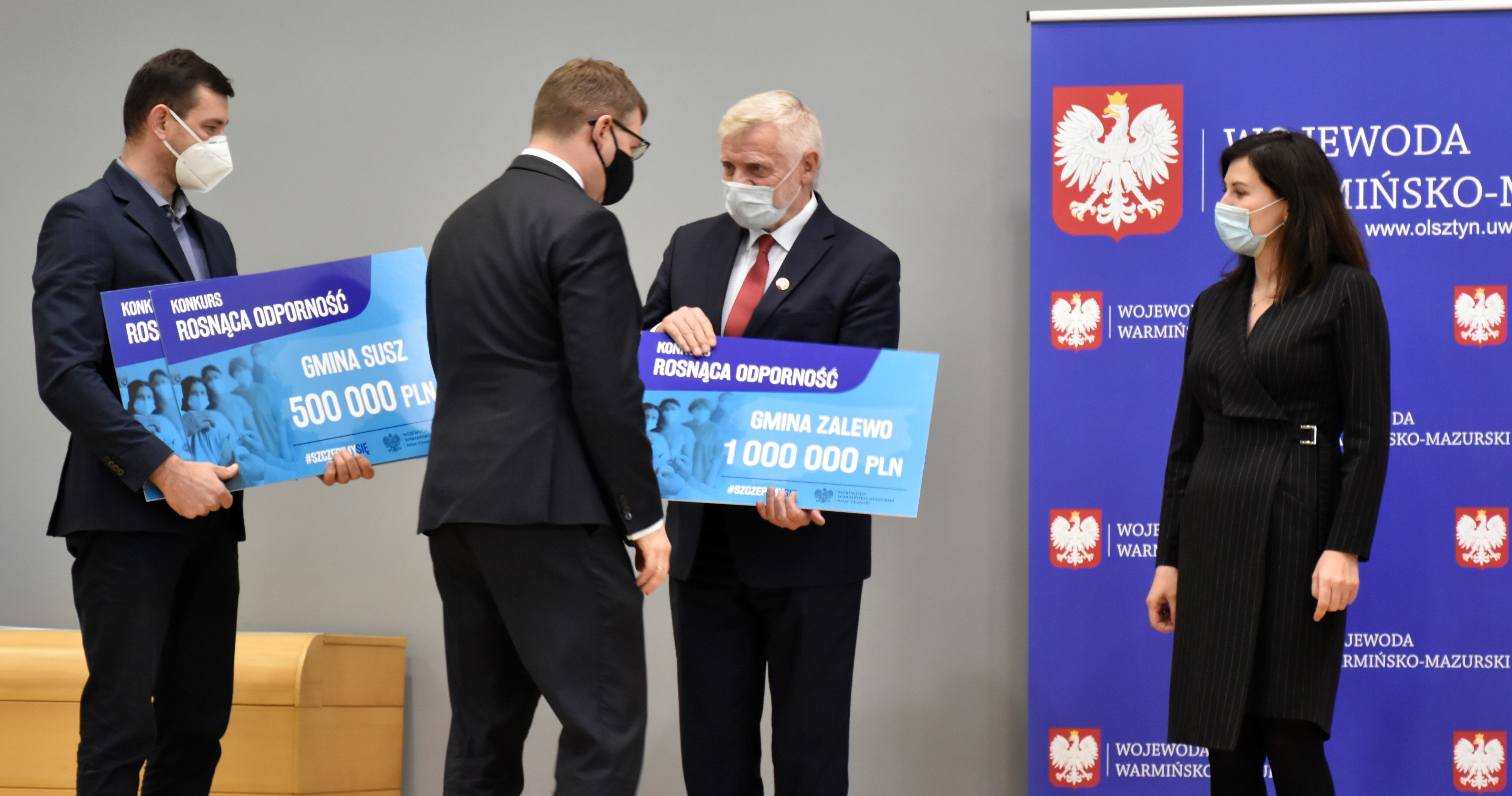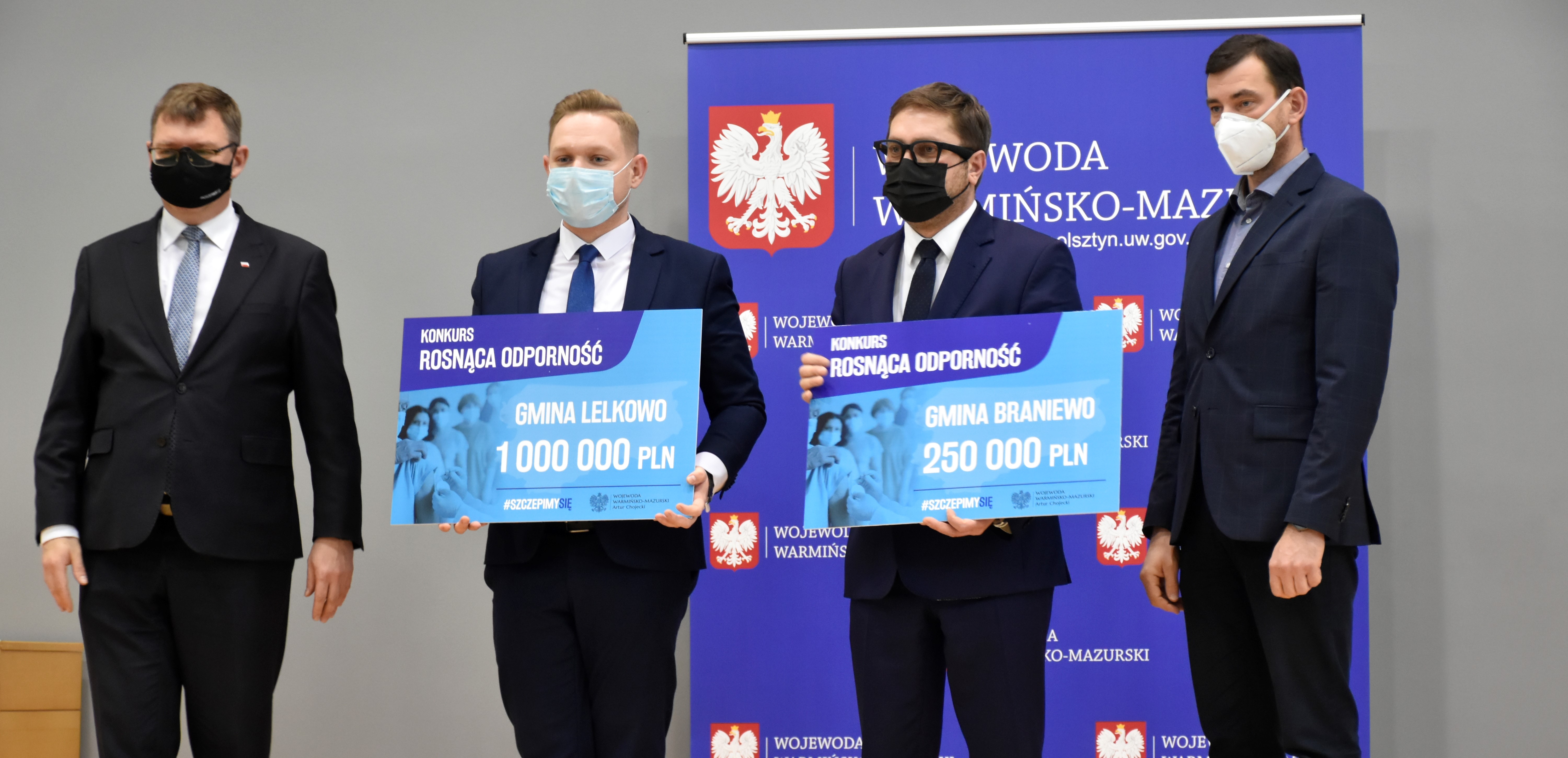 Wojewoda Warmińsko-Mazurski Artur Chojecki i Dyrektor Wydziału Bezpieczeństwa i Zarządzania Kryzysowego Krzysztof Kuriata wręczyli czeki przedstawicielom gmin, które zostały nagrodzone w Konkursie Rosnąca odporność. W naszym województwie 50 gmin otrzymało w sumie 31 milionów złotych.