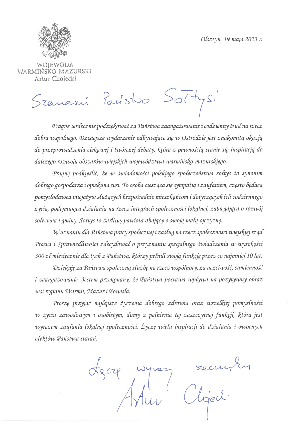 List Wojewody Artura Chojeckiego z okazji Samorządowego Forum Sołtysów na Warmii i Mazurach 19.05.2023 Zdjęcia (1) Pokaż zdjęcie 1 z galerii.