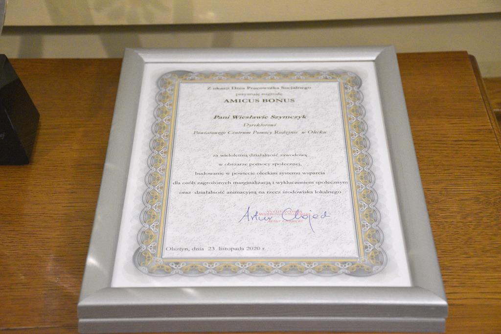 - Pani Wiesława Szymczyk - Dyrektor Powiatowego Centrum Pomocy Rodzinie w Olecku za wieloletnią działalność zawodową w obszarze pomocy społecznej, budowanie w powiecie oleckim systemu wsparcia dla osób zagrożonych marginalizacją i wykluczeniem społecznym oraz działalność animacyjną na rzecz środowiska lokalnego.
