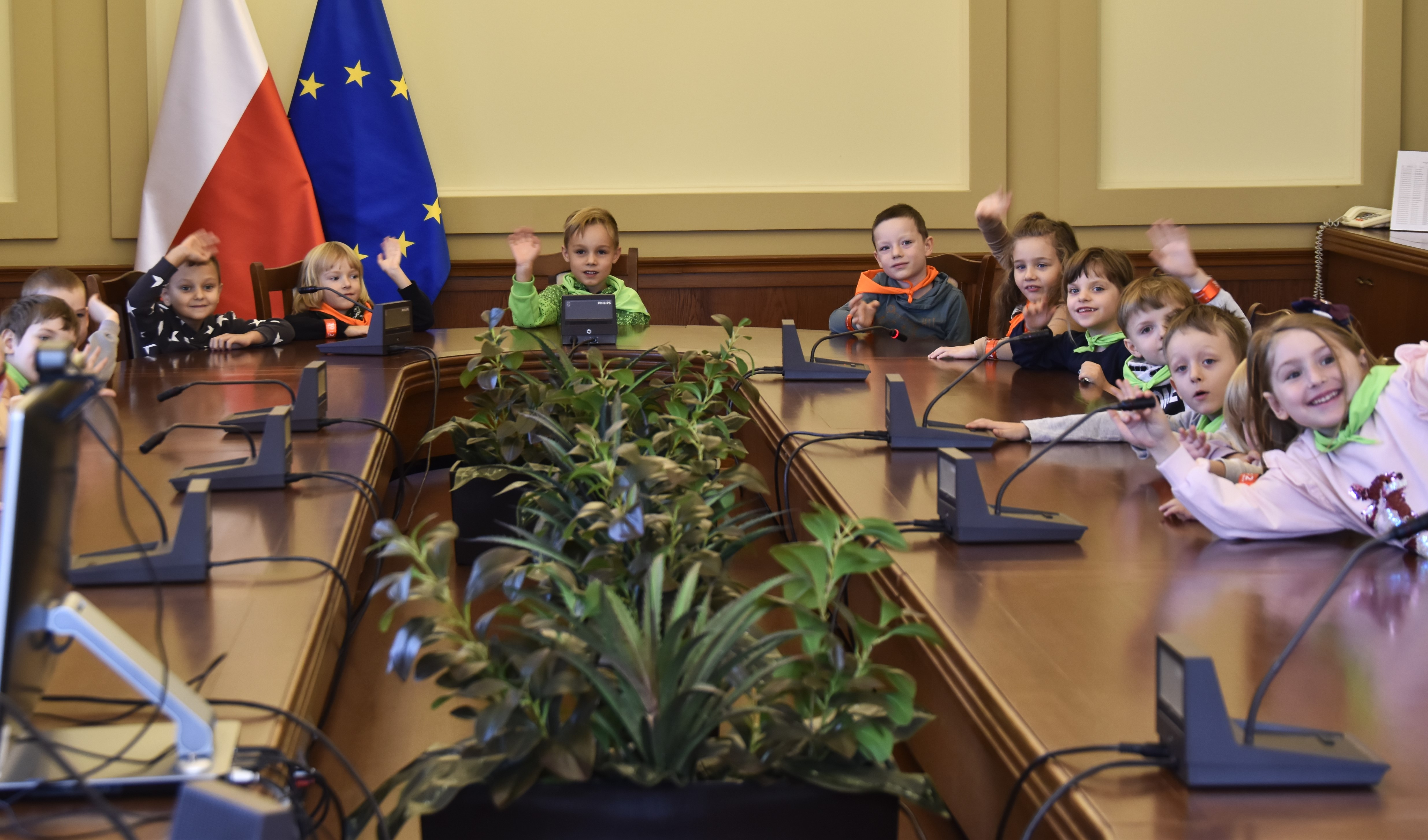 Dzieci mogły także zwiedzić sale konferencyjne urzędu, w których zapadają ważne decyzje dla regionu. To była dla nich okazja, by poczuć się jak prawdziwi urzędnicy i dowiedzieć się, jak różnorodna i odpowiedzialna jest praca w administracji państwowej.