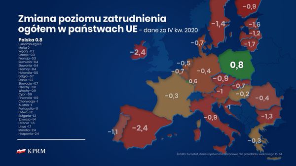 Polska gospodarka nie przestaje pozytywnie zaskakiwać zagranicznych analityków. Właśnie napłynęły nowe dane Eurostatu. Podczas gdy w całej Europie notuje się rekordowe wzrosty bezrobocia - u nas pod koniec roku 2020 wzrósł poziom zatrudnienia. Ten trudny czas przechodzimy dużo lepiej niż pozostałe państwa UE.