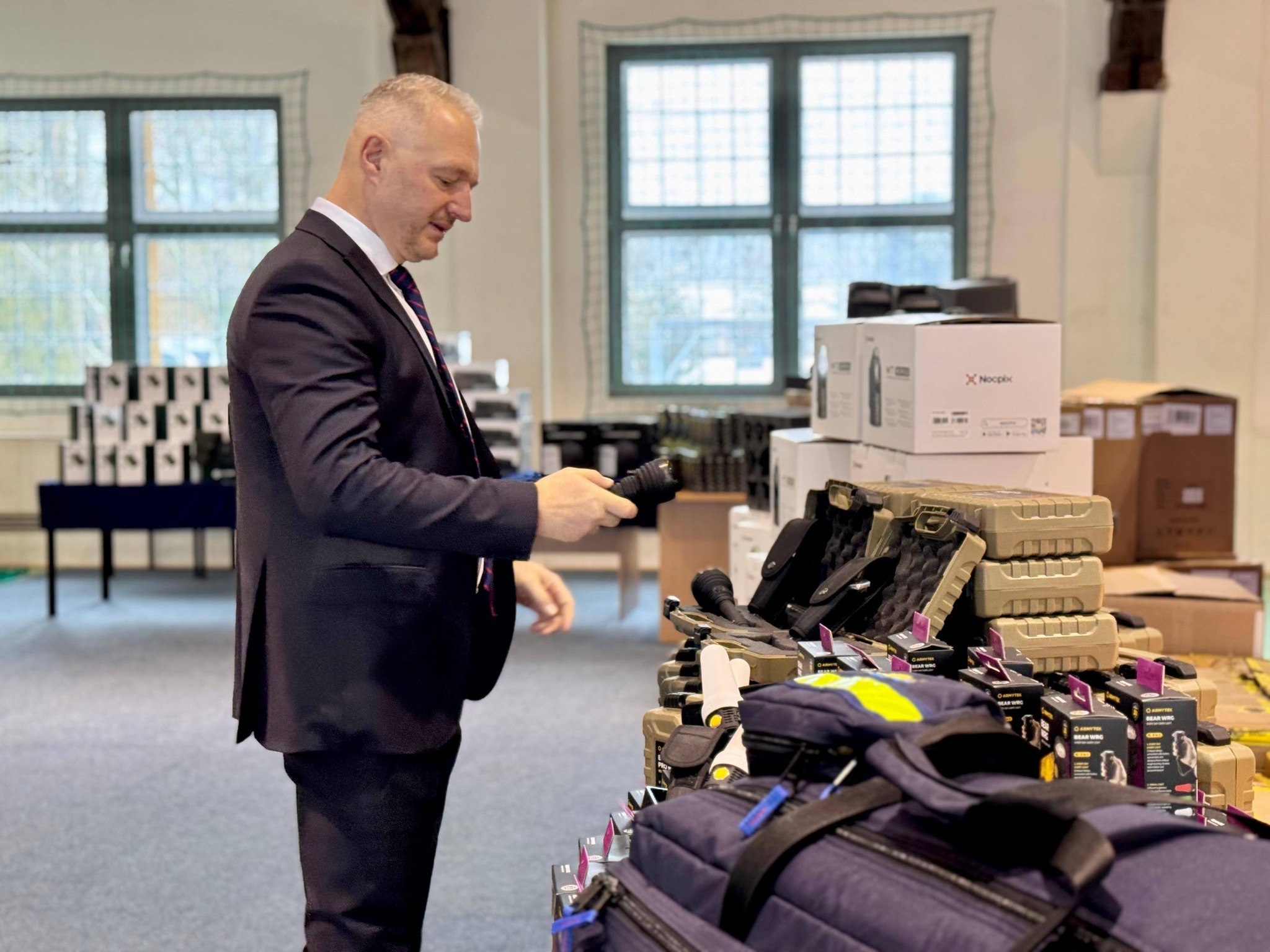 Wojewoda Warmińsko-Mazurski Radosław Król był obecny podczas prezentacji nowoczesnego sprzętu, który trafił do Komendy Wojewódzkiej Policji w Olsztynie. Inwestycja sfinansowana z Programu Ochrony Ludności i Obrony Cywilnej wzmocni potencjał operacyjny funkcjonariuszy i zwiększy skuteczność działań na rzecz bezpieczeństwa mieszkańców województwa warmińsko-mazurskiego.