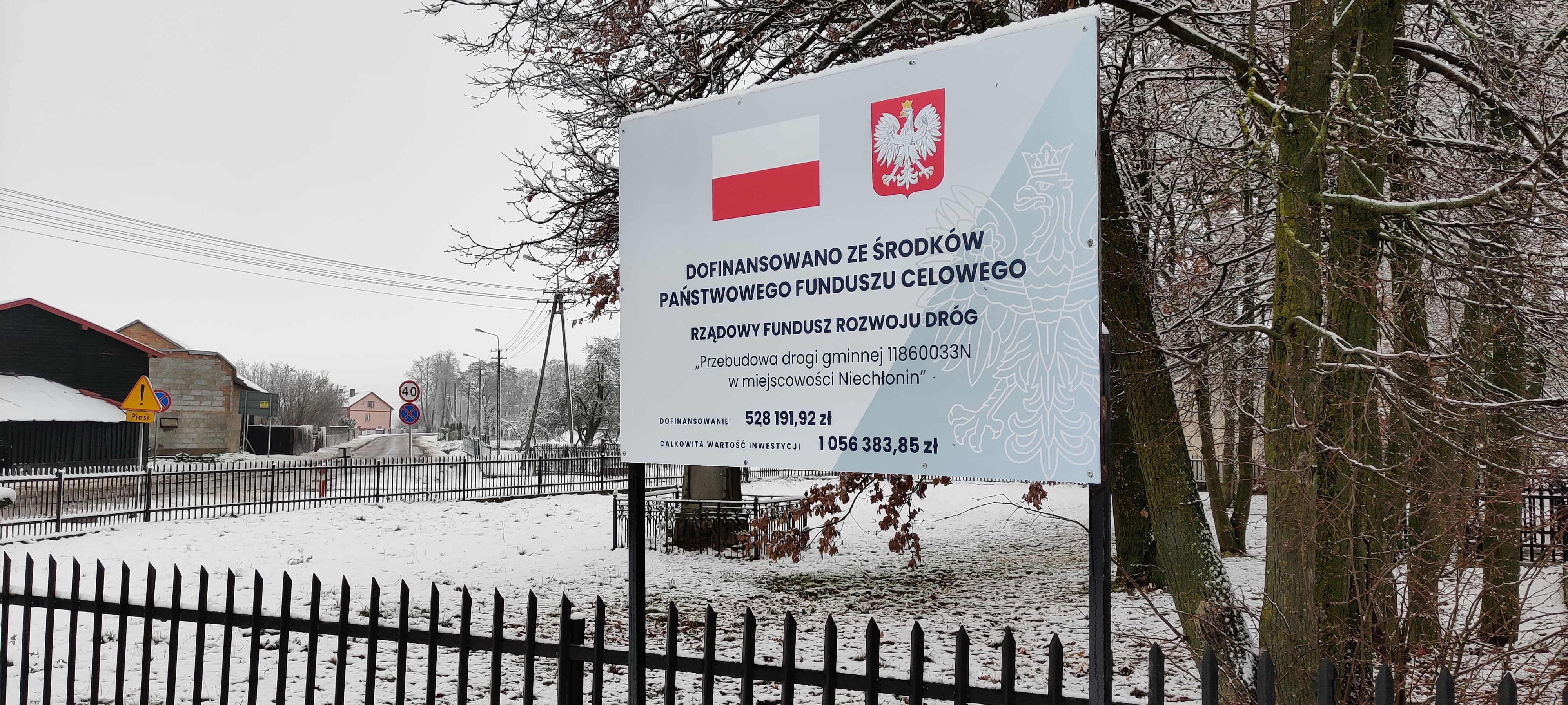 Całkowity koszt przebudowy drogi gminnej w miejscowości Niechłonin wyniósł 1 056 383,85 zł, z czego dofinansowanie z z Rządowego Funduszu Rozwoju Dróg stanowiło 528 191,92 zł, a z gminy 528 191,93 zł. W ramach inwestycji została przebudowana droga na odcinku 1 216 mb. Wykonano nową nawierzchnię z betonu asfaltowego z odwodnieniem, ścieżkę rowerową wraz z oświetleniem solarnym, chodniki, wyniesione przejście dla pieszych oraz zatokę autobusową. Przebudowana droga rozwinie istniejącą sieć dróg w gminie Płośnica, łączyć będzie się z drogami gminnymi a także bezpośrednio drogą powiatową nr 1304N i 1361N.