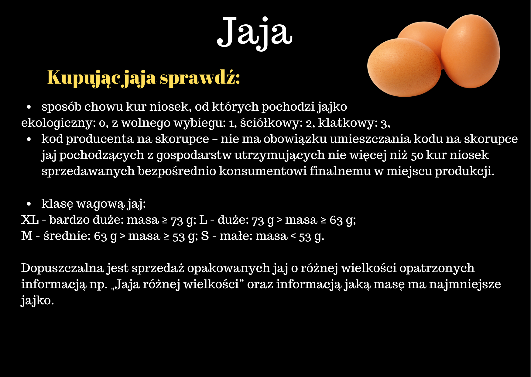 - Dopuszczalna jest sprzedaż opakowanych jaj o różnej wielkości opatrzonych informacją np. „Jaja różnej wielkości” oraz informacją jaką masę ma najmniejsze jajko.