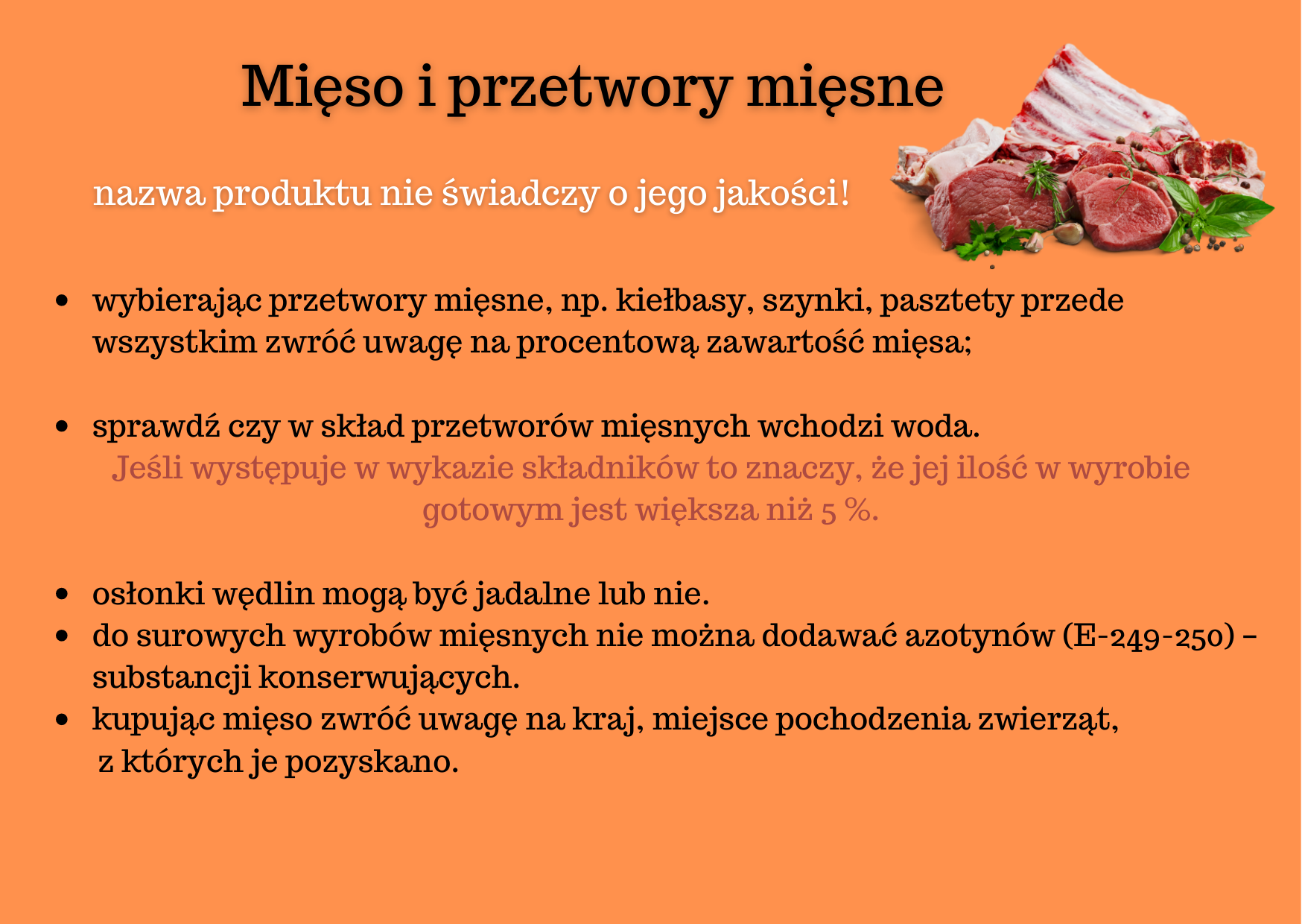 - wybierając przetwory mięsne, np. kiełbasy, szynki, pasztety przede wszystkim zwróć uwagę na procentową zawartość mięsa, która świadczy o ilości mięsa jaka została wykorzystana do ich wyprodukowania. Z kolei, gdy wybierasz produkty suszone lub podsuszane zwróć uwagę z ilu gram mięsa wyprodukowano 100 g produktu.