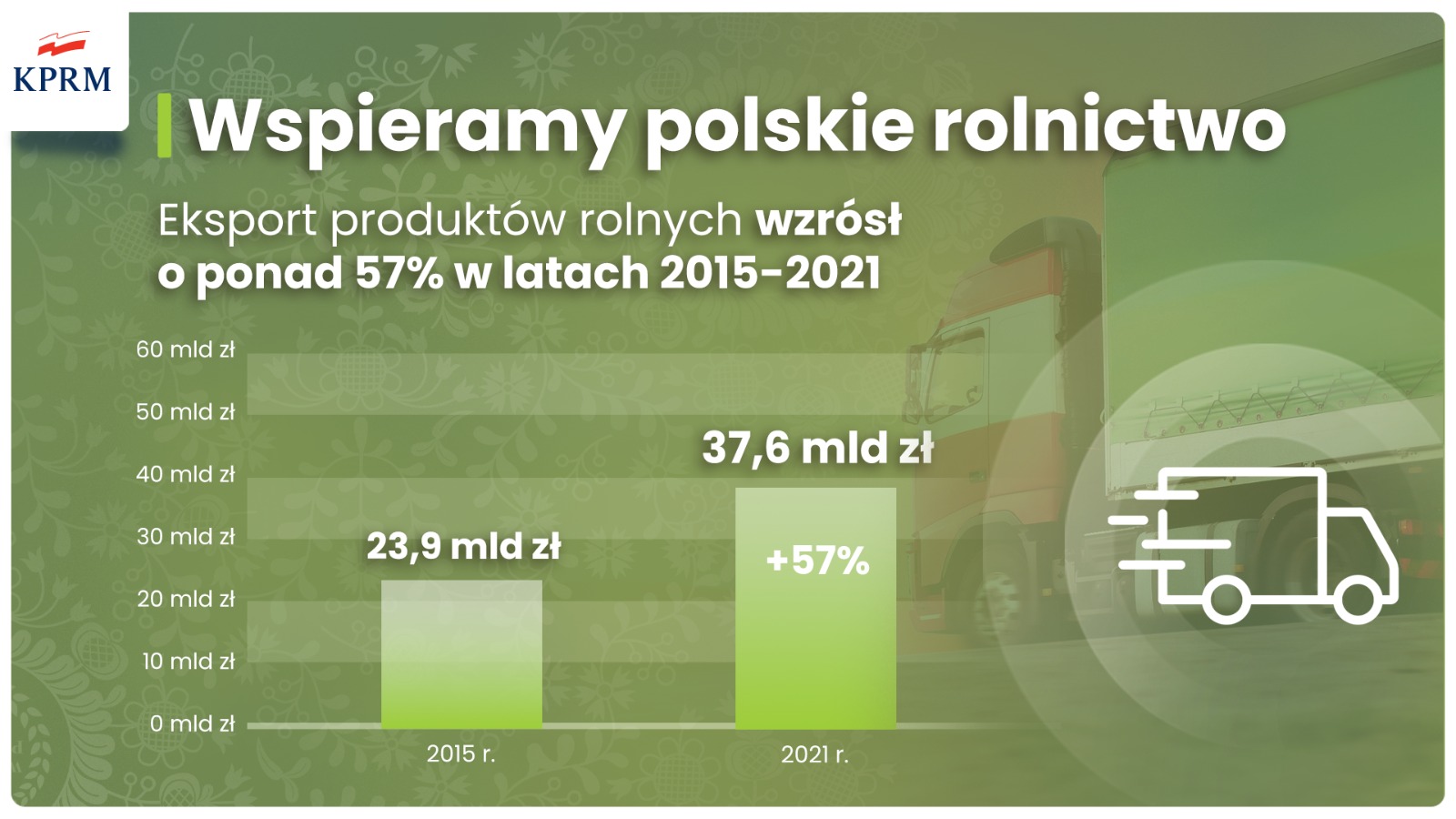 Wzrosły także emerytury rolnicze aż o 23,3 proc. z 1070,28 zł w roku 2015 do 1339,04 zł w 2021 r. Dodatkowo emeryci otrzymują 13 i 14 emeryturę. Ponadto polskie rolnictwo stało się bardziej konkurencyjne. Wzrósł eksport produktów rolnych. W latach 2015 – 2021 wzrósł z 23,9 mld zł do 37,4 mld zł, czyli aż o ponad 56 proc.
