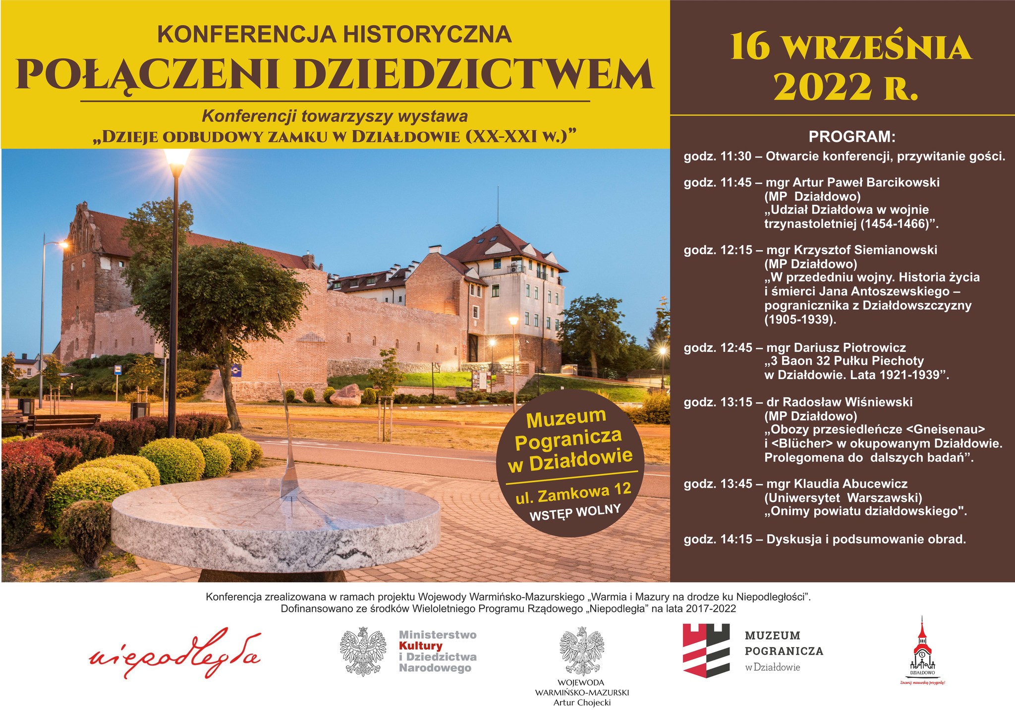 O godzinie 11:30 otwarcie konferencji „Połączeni dziedzictwem”. Wydarzeniu towarzyszyć będzie wystawa autorstwa pracowników muzeum, pt. "Dzieje odbudowy zamku w Działdowie (XX-XXI w.)". Szczegółowy plan wydarzenia znajduje się na poniższym plakacie.
