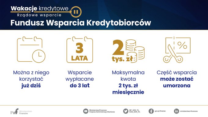 Fundusz umożliwia zawieszenie płatności rat do 3 lat. W przypadku spłacenia bez opóźnień 100 ze 144 rat, pozostała część jest umarzana. Dowiedz się więcej o rządowym wsparciu dla kredytobiorców.