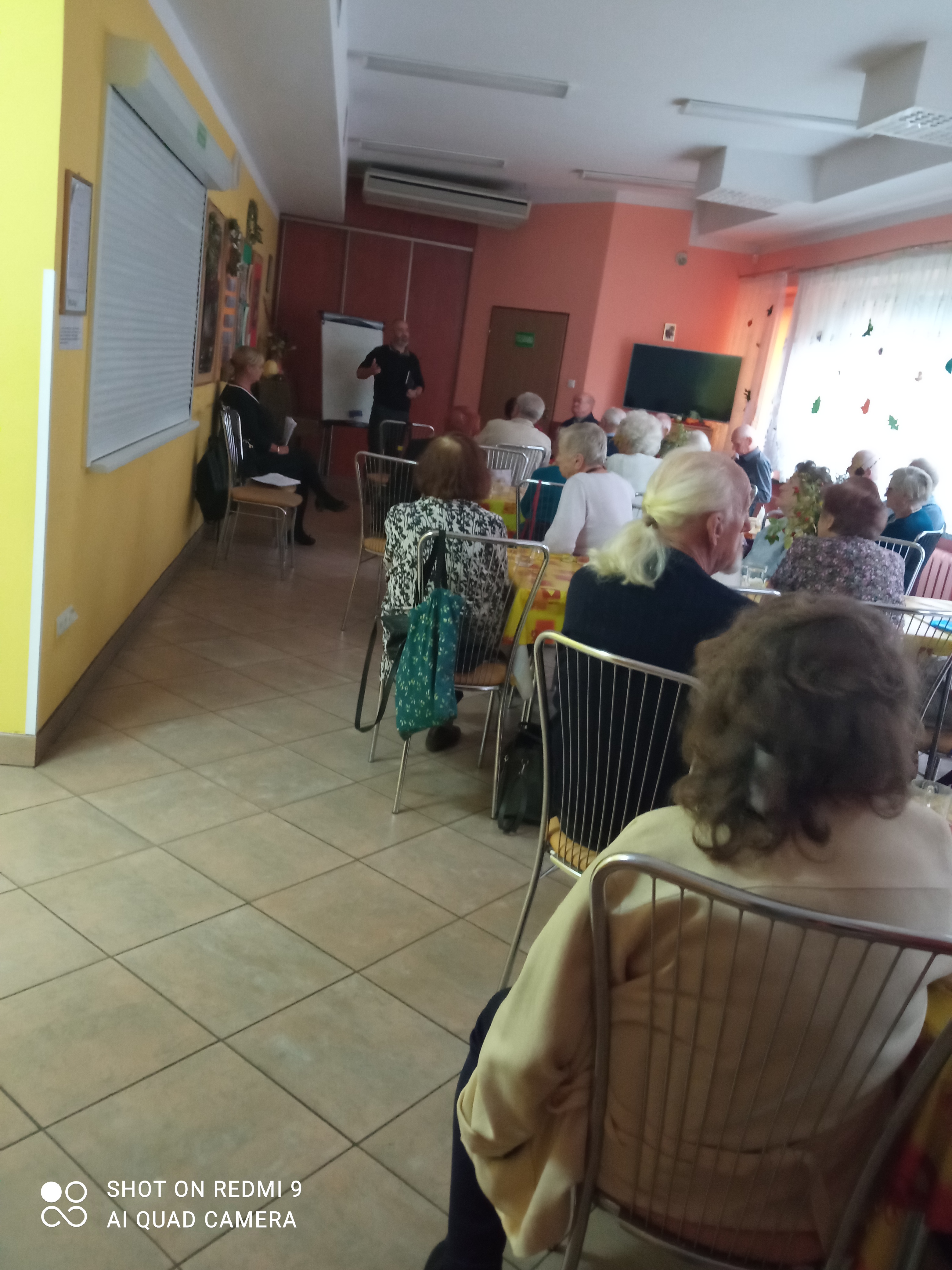 z samoobrony dla seniorów. Instruktor poprowadził pogadankę oraz ćwiczenia praktyczne, jak zachować się w sytuacji zagrożenia na ulicy, w parku czy w domu.