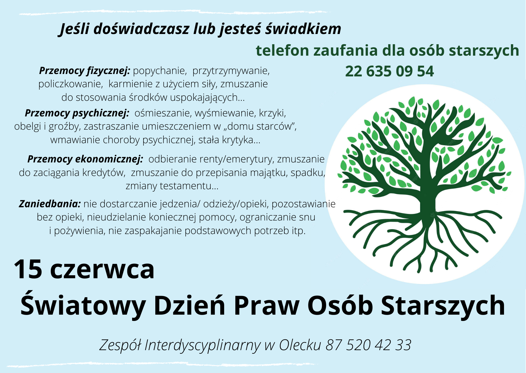 Członkowie Zespołu Interdyscyplinarnego w Olecku, w związku ze Światowym Dniem Praw Osób Starszych obchodzonym corocznie 15 czerwca, w maju 2022 r. przygotowali plakat. Plakat razem z ulotkami dotyczącymi przeciwdziałania przemocy wobec osób starszych został przekazany przez przewodniczącą Zespołu Interdyscyplinarnego do Klubu Seniora, Dziennego Domu Seniora oraz Związku Emerytów i Rencistów. Ponadto plakat został przesłany do wszystkich instytucji działających na terenie Miasta Olecka z prośbą o jego wyeksponowanie w budynkach. Na stronie internetowej Miejskiego Ośrodka Pomocy Społecznej w Olecku oraz w zakładce Zespołu Interdyscyplinarnego zamieszczono grafikę z plakatem oraz informację o Światowym Dniu Praw Osób Starszych.