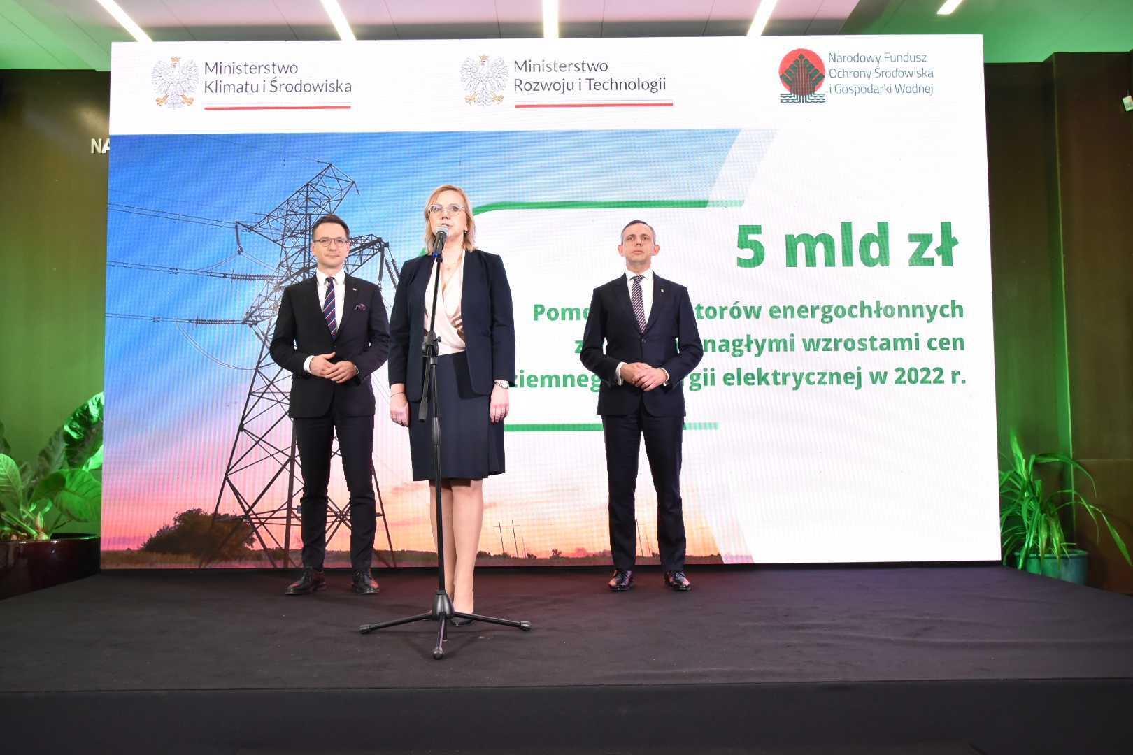 „Mamy dzisiaj bardzo dobre wiadomości dla branży energochłonnej – kolejne wsparcie. Od 2016 r. konsekwentnie wspieramy ten sektor, który jest absolutną podstawą naszej gospodarki i przemysłu” – zaznaczyła minister klimatu i środowiska Anna Moskwa podczas konferencji prasowej dot. inauguracji programu „Pomoc dla sektorów energochłonnych związana z nagłymi wzrostami cen gazu ziemnego i energii elektrycznej w 2022 r.”. W spotkaniu, które odbyło się 9 lutego 2023 r. w Warszawie, uczestniczyli również minister rozwoju i technologii Waldemar Buda oraz wiceprezes Narodowego Funduszu Ochrony Środowiska i Gospodarki Wodnej Paweł Mirowski.