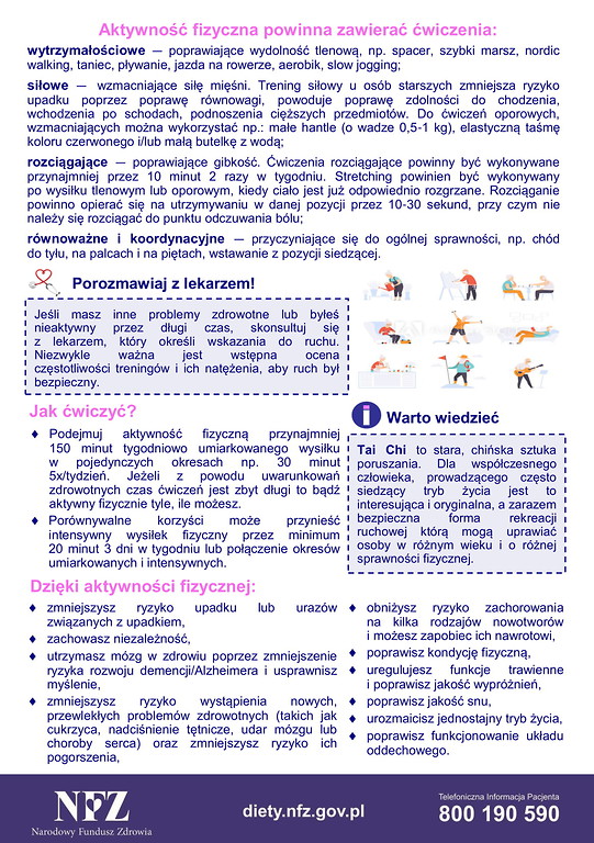 Codzienna aktywność fizyczna jest warunkiem dobrego stanu zdrowia w każdym wieku. Większa sprawność zmniejsza liczbę upadków, a co za tym idzie – zapobiega niesamodzielności. Aktywność ruchowa jest najbardziej skutecznym – spośród znanych dotychczas – sposobem opóźniania procesów starzenia się, wpływa również na poprawę kondycji psychofizycznej. Zapraszamy do lektury poniższej broszury oraz do zapoznania się z materiałem filmowym na kanale Akademia NFZ na youtube.pl.