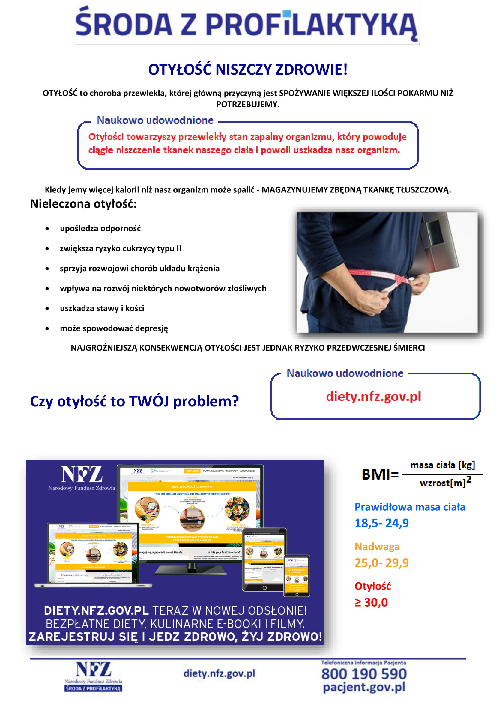 Z poniższej broszury dowiedzą się Państwo jakie są najczęstsze konsekwencje nieleczonej otyłości, jak wyliczyć swoje BMI i wiele innych. Zachęcamy również do zapoznania się z materiałem filmowym na kanale Akademia NFZ na youtubie.pl