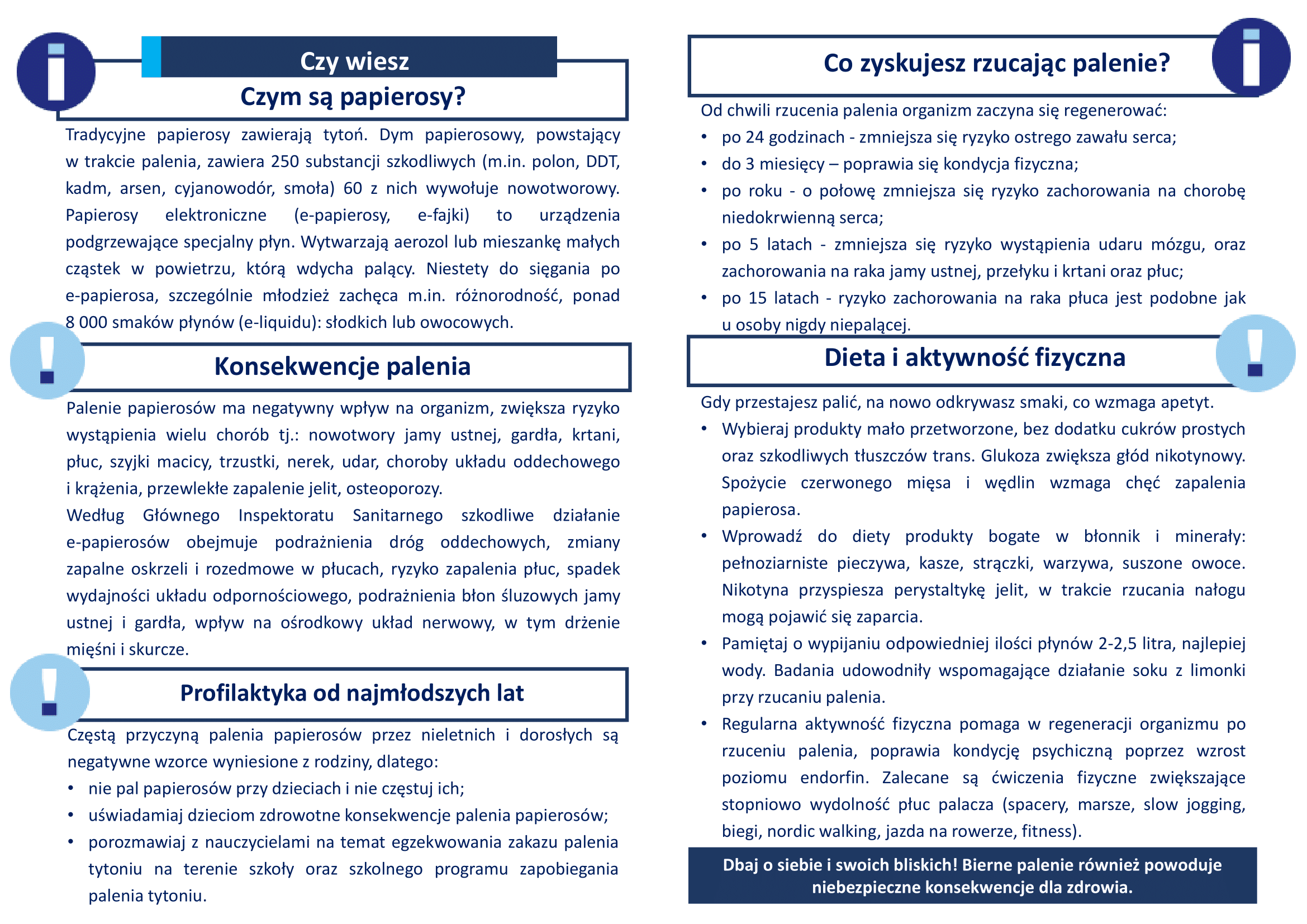 Czym się różni tradycyjny papieros od e-papierosa? Jakie są konsekwencje palenia? Co zyskujesz rzucając palenie? Co robić, aby zminimalizować ryzyko uzależnienia od palenia? Gdzie szukać pomocy? Czy dieta i aktywność fizyczna pomogą w rzuceniu palenia? Odpowiedzi na te pytania znajdziesz w ulotce.
