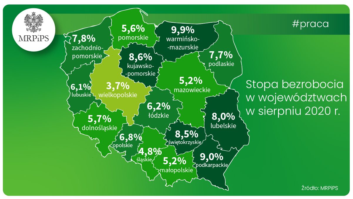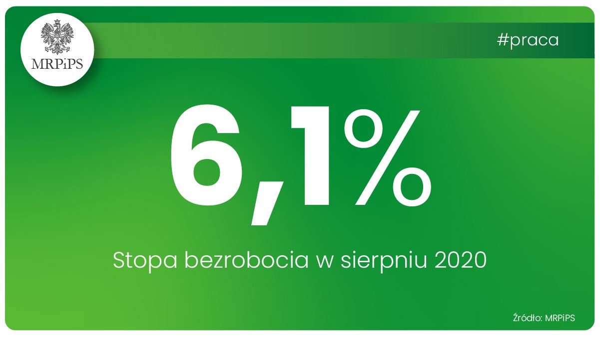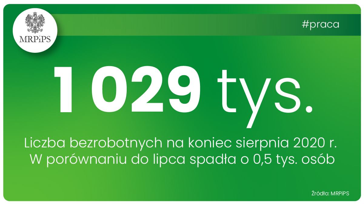 Ze wstępnych danych wynika, że liczba bezrobotnych w końcu sierpnia 2020 roku wyniosła 1 029,0 tys. osób i w porównaniu do poprzedniego miesiąca spadła o 0,5 tys. osób, czyli o 0,05 proc.