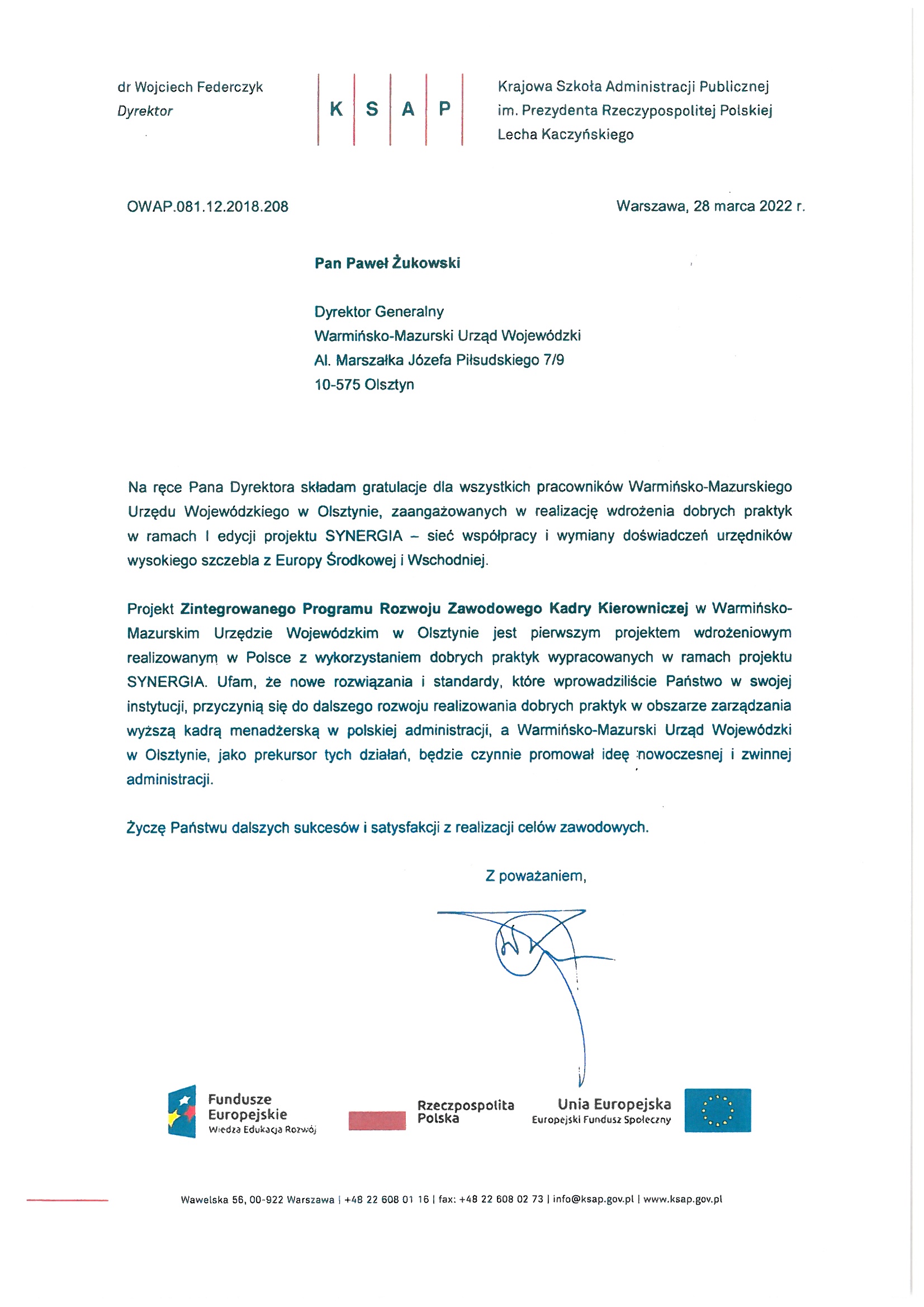 Uprzejmie informujemy, że decyzją Komisji Konkursowej, do udziału w części wdrożeniowej I edycji projektu SYNERGIA zakwalifikowano Warmińsko – Mazurski Urząd Wojewódzki w Olsztynie, z projektem pod nazwą Zintegrowany Program Rozwoju Zawodowego Kadry Kierowniczej – program budowania warsztatu zarządczego. Serdecznie gratulujemy!